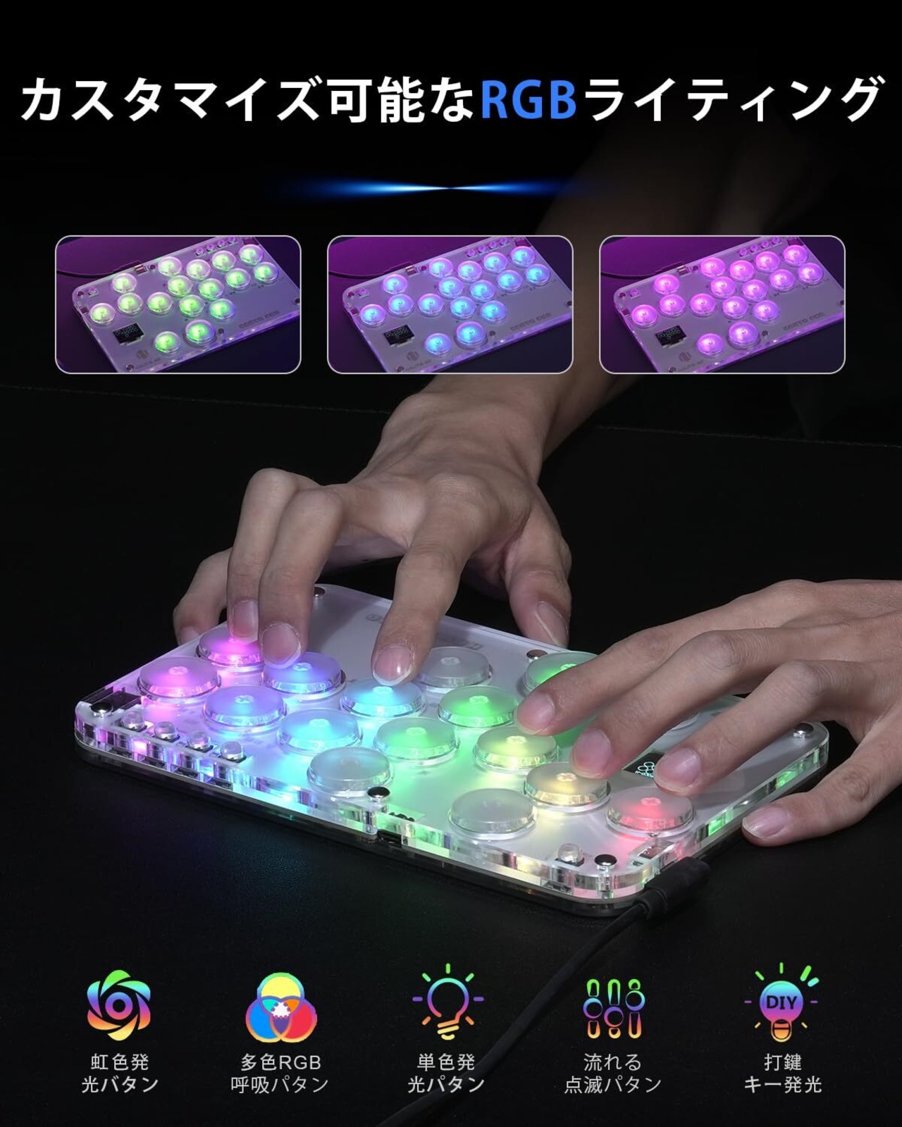 「自由自在にDIY可能」 お好みに合わせて自分のデザインで天板やスプラッシュスクリーンをカスタマイズ可能!ホットスワップに対応しているので、スイッチやキーキャップの改造を手間無く便利に行える。そして、設定でRGBライティングの光度や彩色、パターンなども変更できる。自分の好みに合わせてレバーレス アケコンを自由に改造しよう。