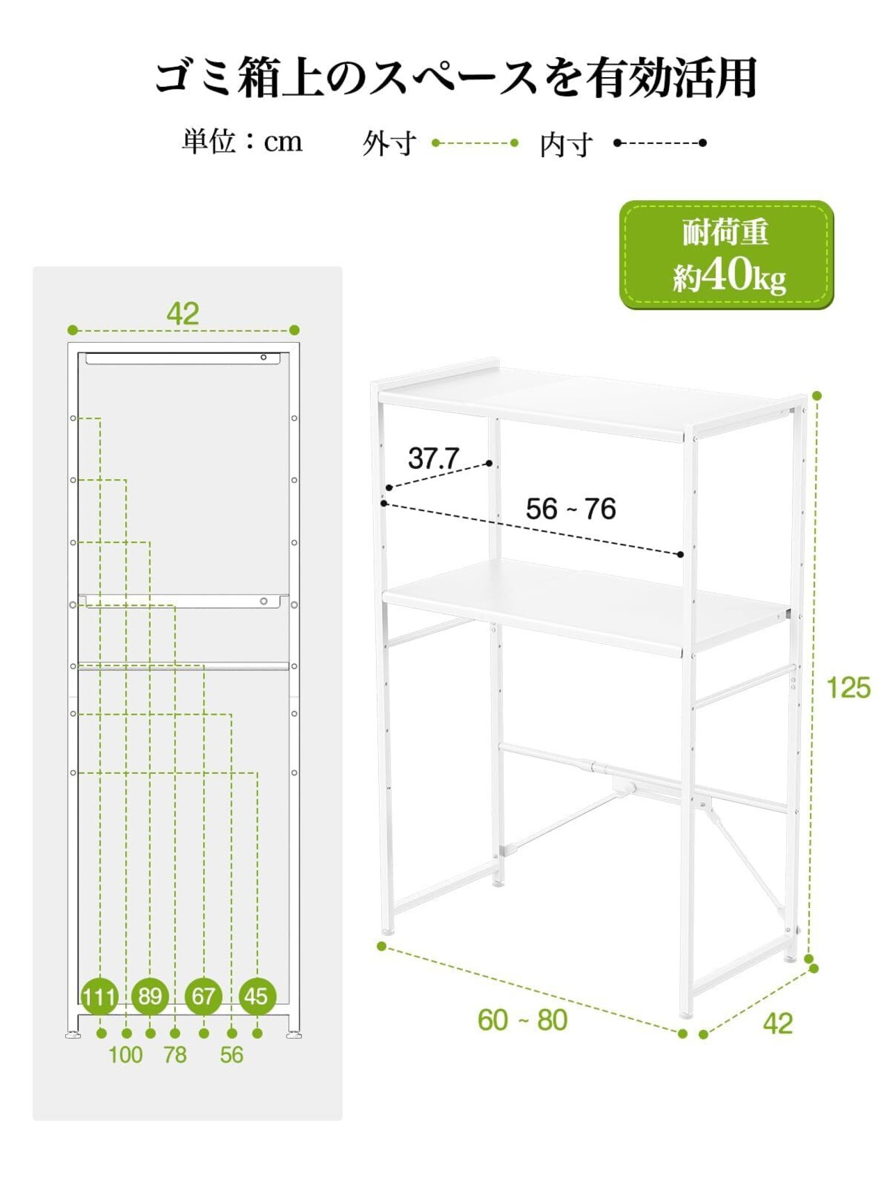 【多機能キッチンラック仕様】サイズ:約幅60~80×奥行き42×高さ125cm(アジャスター含)/可動棚の間隔:約11cm 8段階調整可能/耐荷重:約40kg/材質:スチール(紛体塗装)/製品重量:約9kg デッドスペースになりがちなゴミ箱上の空間を収納スペースに。