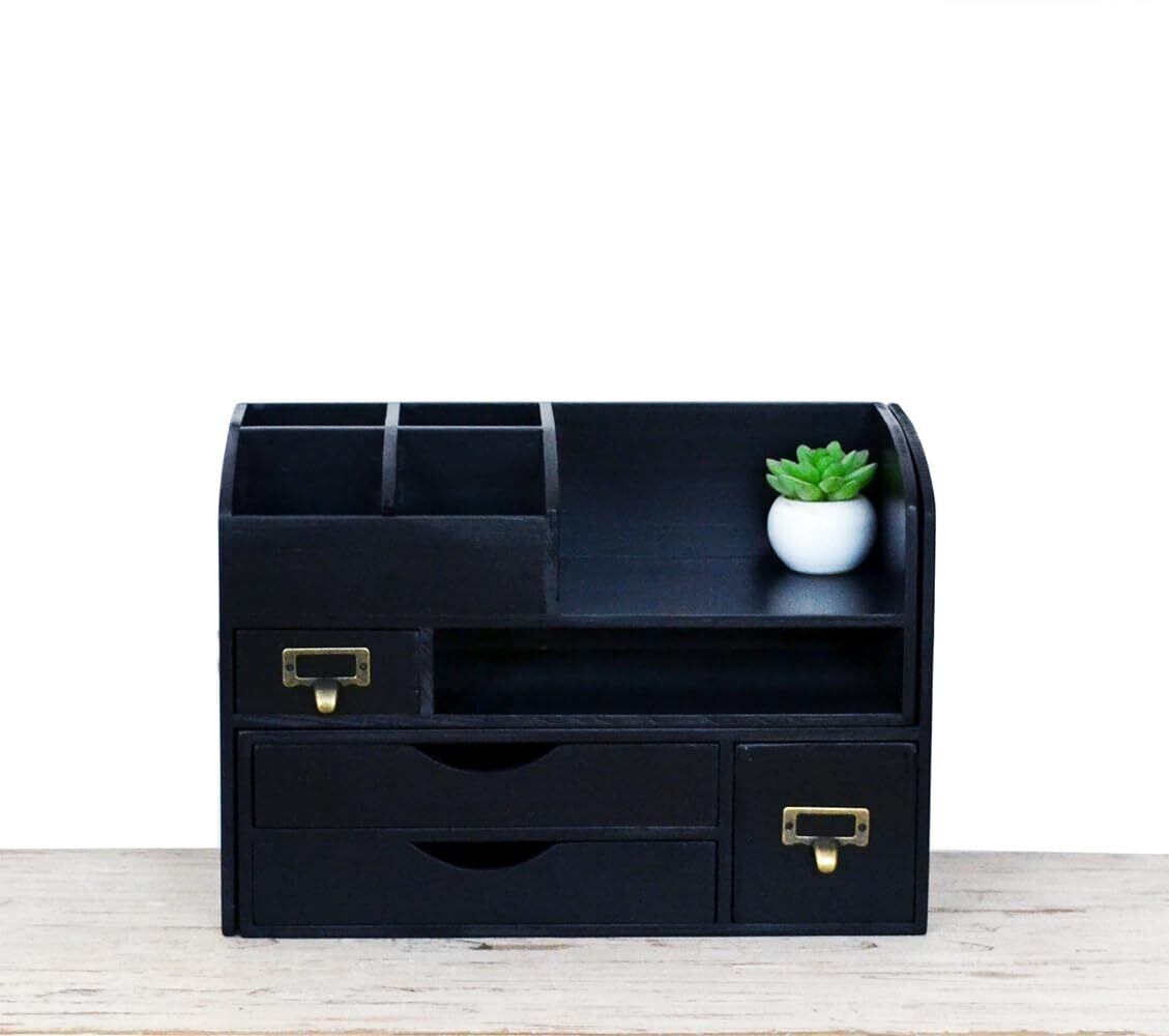Juleduo デスクオーガナイザー 小物入れ 卓上棚 木製 伸縮型 本たて コスメ収納 卓上置き棚 リモコンラック (ブラック)