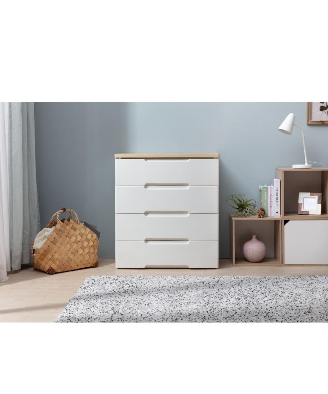 主要材質 ●天板:合成樹脂化粧繊維板(塩化ビニル・MDF) ●本体・引出し:ポリプロピレン ●前パネル:スチロール樹脂