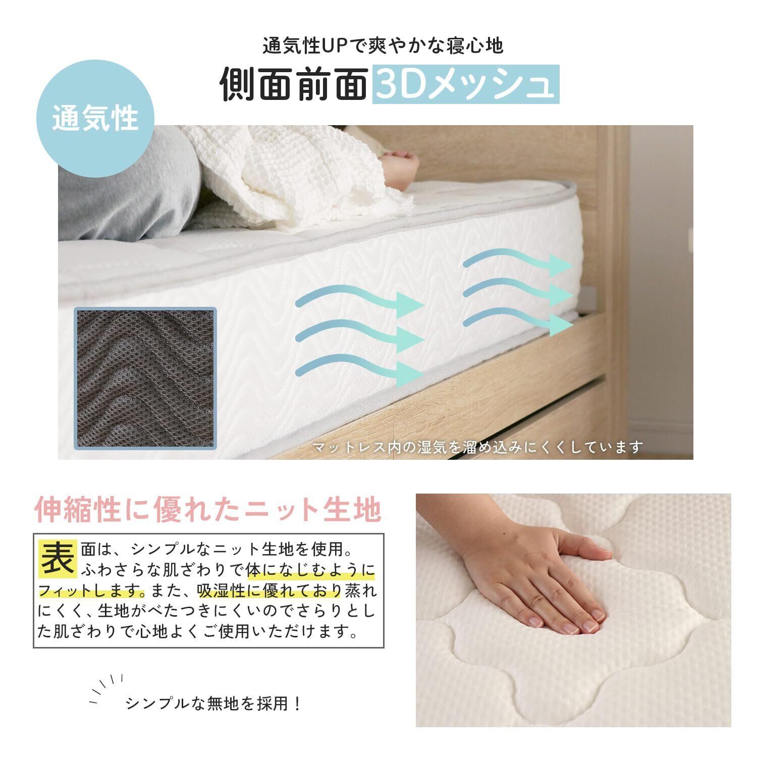 【快適性高める3Dメッシュ構造】 側面全面が3Dメッシュを採用することにより通気性アップで一年中快適な寝心地・使い心地を実現できます。また、コイルは並行配列の構造をしているため、空気がコイルの隙間を通り抜けることができ、湿気対策にも役立ちます。人体から発散される汗や熱気、湿気などを分散させ、余分な湿気を取り除くことができるため、通気性が非常に良いです。
