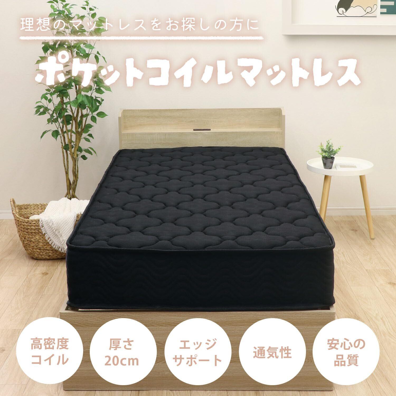 【体安らぐ安眠ポケットコイルマットレス】 ポケットコイルはコイルが背骨の形に合わせて個別に変化することで、心地良いフィット感を生み出します。身体の広い範囲に圧力を分散し部分的な負荷の集中を抑え、睡眠中の身体への負担を軽減します。ふっくらとした快適な寝心地で上質な安眠時間を作り出します。厚さ20cmとボリュームたっぷりのウレタンフォームが底つき感を感じにくくしています。また一度沈み込んでもすぐに元のきれいな状態に回復します。