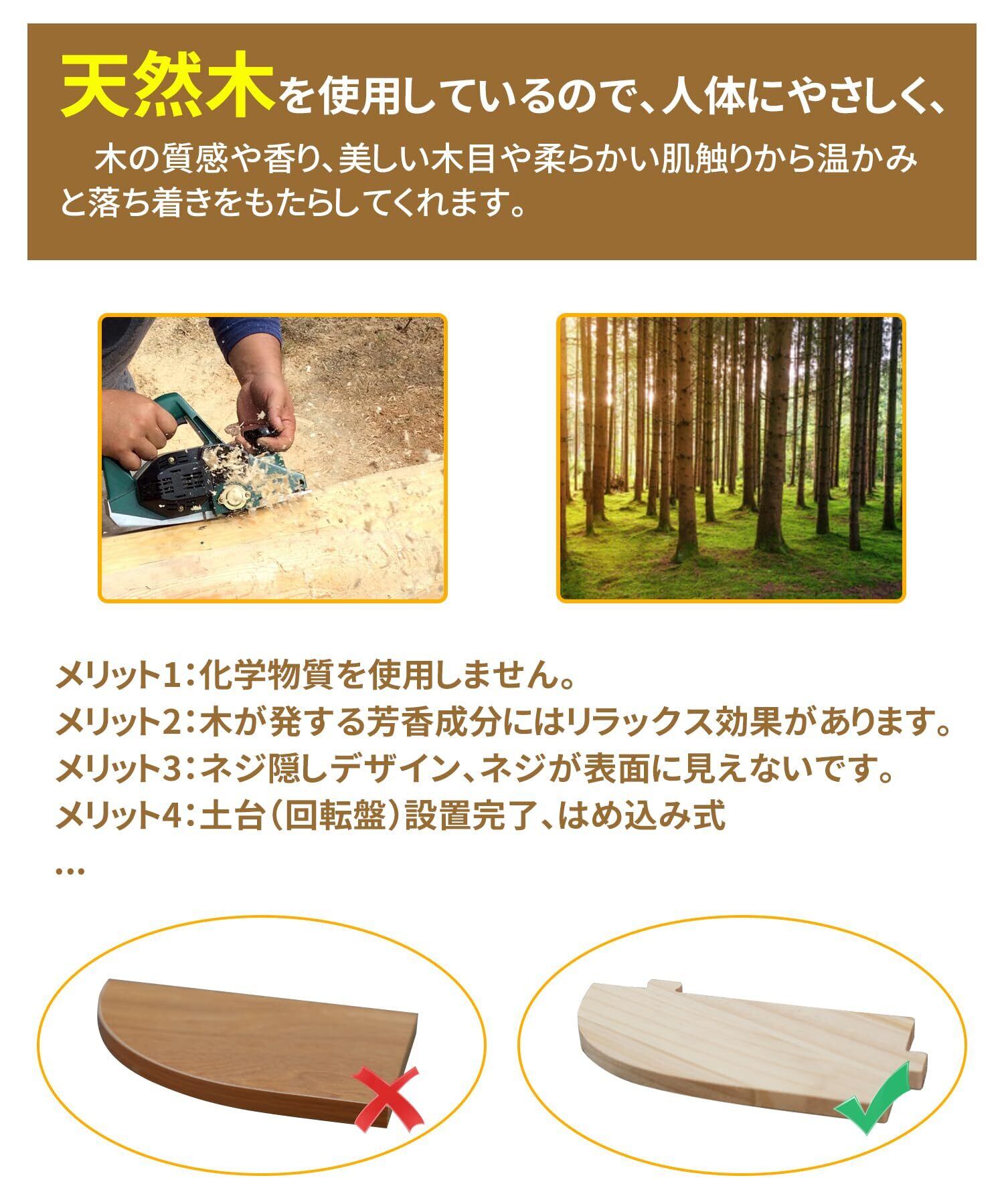 【100%の無垢材】天然の無垢材が使われており、木の風合いがやさしいです。滑らかな棚は耐磨、水や汚れに強い、防サビ、布で拭くだけで、きれいになっております,人間工学に基づいた円形設計で、ぶつかっても怪我を防げて柔らかい印象を与え、より安全で快適に使用できます。