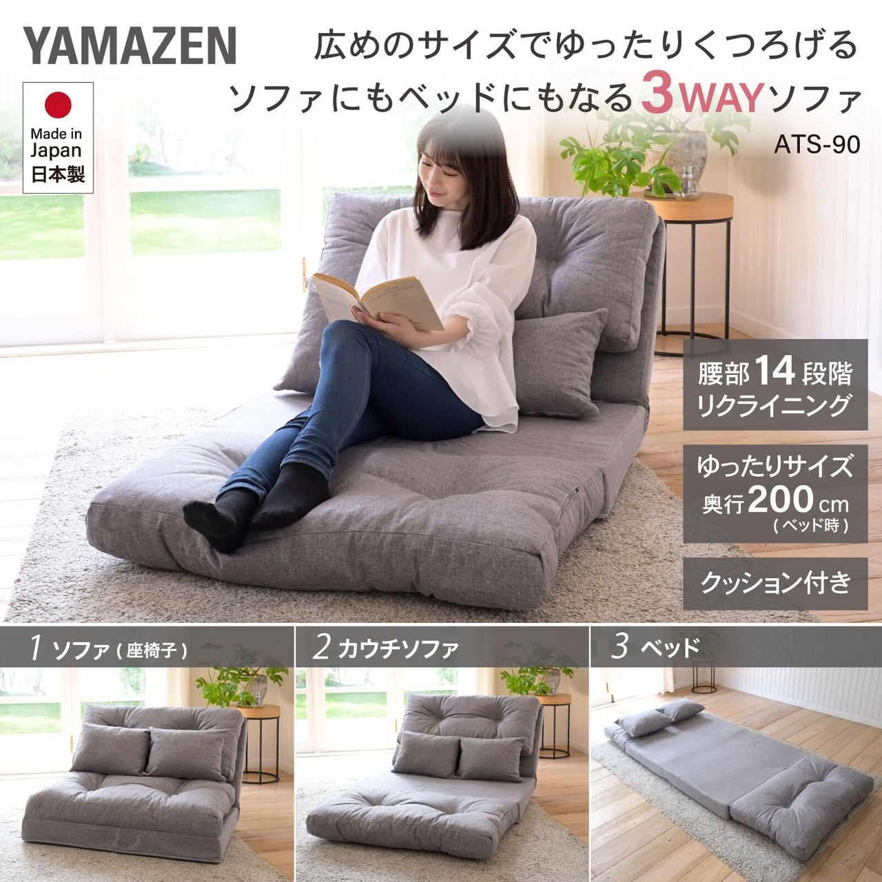 山善(YAMAZEN) ソファ ソファーベッド カウチ 3WAY 日本製 ゆったり 一人掛け クッション付き 腰部14段階 リクライニング 簡易ベッド ローソファ 幅90×奥行70/200×高さ16/59cm 一人暮らし 完成品 アイボリー ATS-90K(IV)