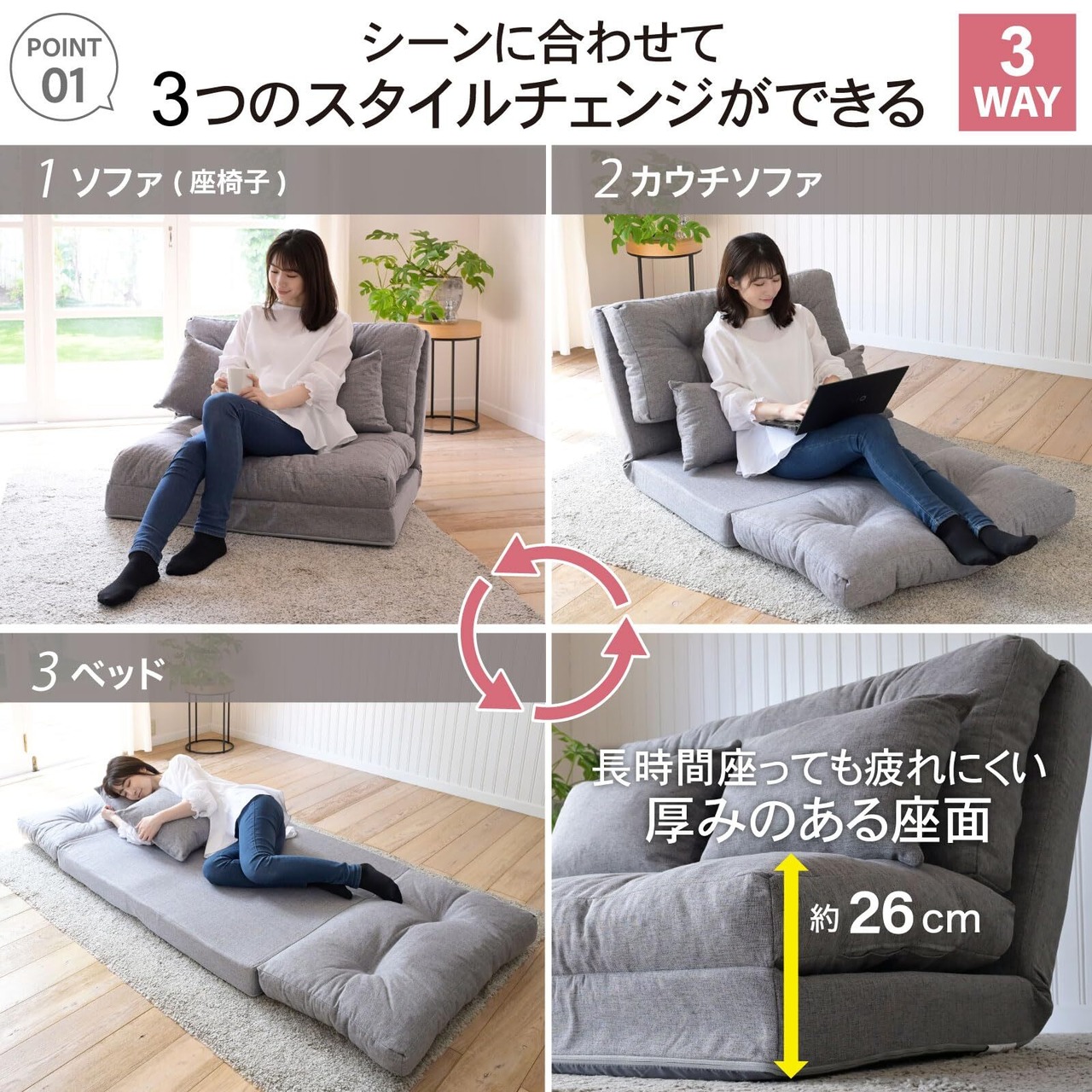 【ソファにもベッドにもなる3WAY】ソファ・カウチソファ・ベッドと、3wayで使えるソファです。お部屋やシーンに合わせてカンタンにスタイルチェンジできます。