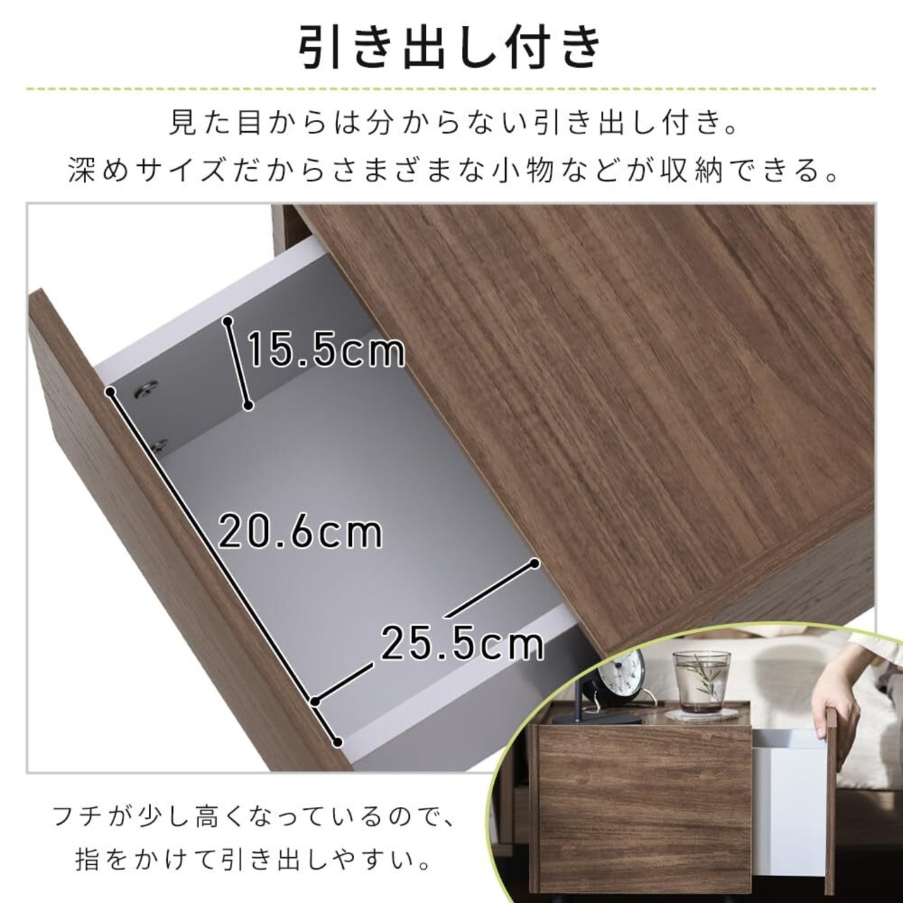 見た目からは分からない引き出し付き。深めサイズだからさまざまな小物などが収納できる。