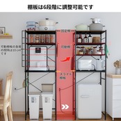多機能収納ラック:真ん中の2枚棚板可動式なのでゴミ箱、冷蔵庫、レンジラックなど収納する物に合わせて高さを調整できる。約10㎝ぐらいの6段階可動棚。下の1枚棚板スライド式+コンセント付きはレンジ炊飯器など操作しやすい。下の空間でゴミ箱、冷蔵庫、洗濯機など収納できる。棚板の上でレンジ台、炊飯器、プリント台などを収納できる。空間を有効利用、省スペース、収納がたっぷりできる。十分に横幅があるので、最大45Lゴミ箱でも最大2-3つ横並びで置けられる。ゴミ箱の蓋もしっかり開けられます。ゴミ箱以外に、冷蔵庫、洗濯機もコンパクトに収まります。左側と右側がSフックもある。
