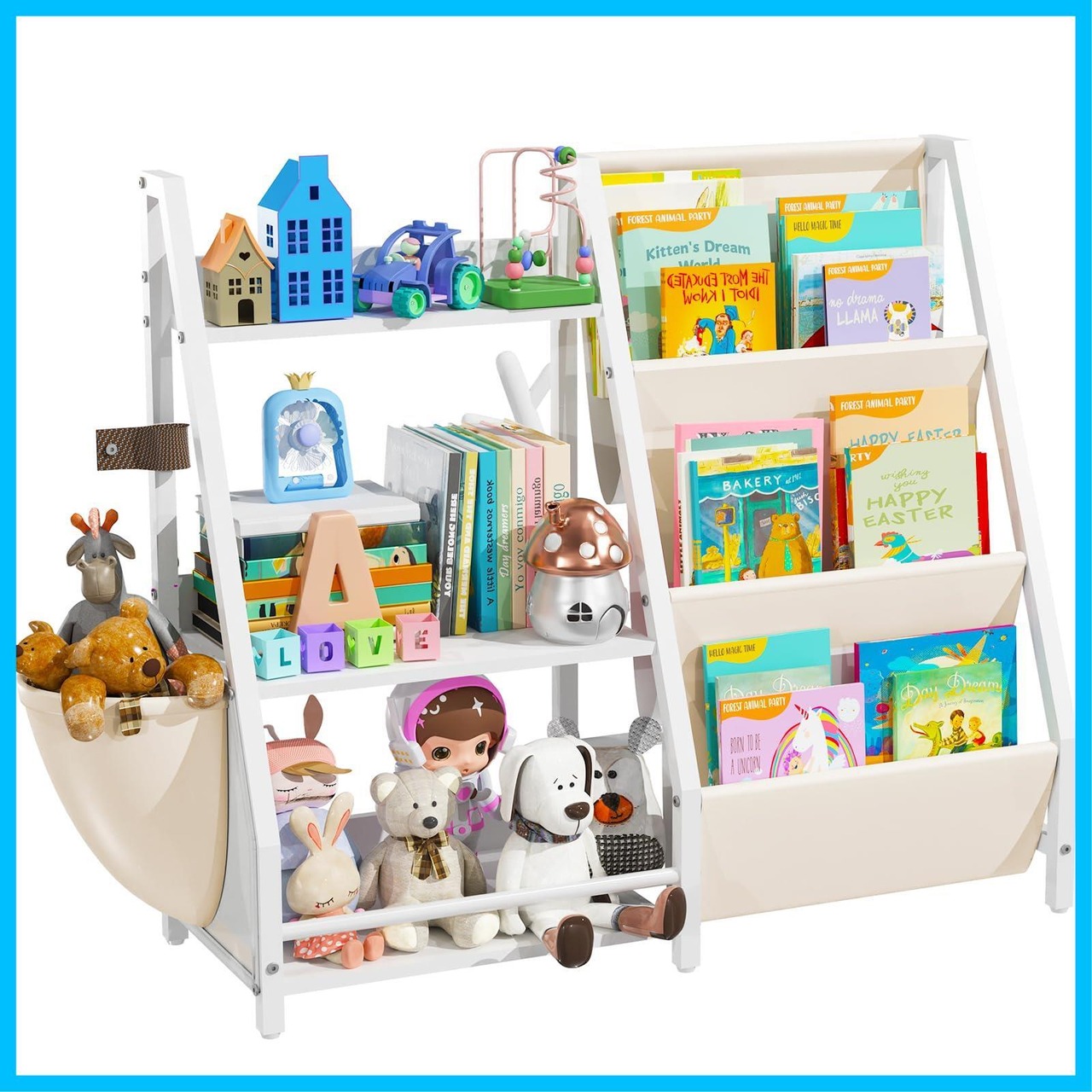 【ミニキッズ本棚で可能性を解き放とう】 おもちゃと本を整理するデザインで、散らかりを好奇心に変える子供用本棚。幼児が数秒で本を取り出せるように設計された本棚です。アクションフィギュアやアート用品などの小さなお宝を収納するサイドポケット付き。コンパクトサイズ(幅84 cm × 奥行き30 cm × 高さ76 cm)のキッズ本棚は隅にぴったり収まりながら、たくさんのおもちゃ、パズル、ぬいぐるみを収納できます