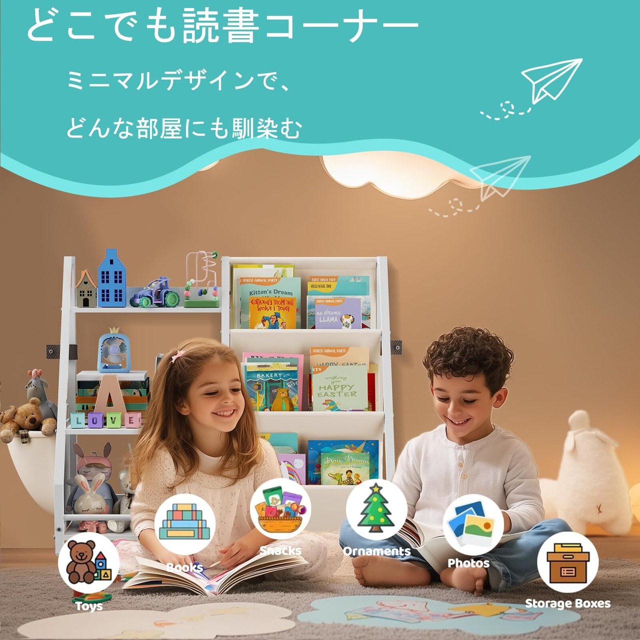 【簡単セットアップのキッズ用本棚】 箱を開けて、10分で完成。工具付属、ストレスのない組み立て。ジュースをこぼしても拭くだけ。落書きしても消せる。私たちは親の苦労を理解し、誰でも簡単に使えるように設計しました