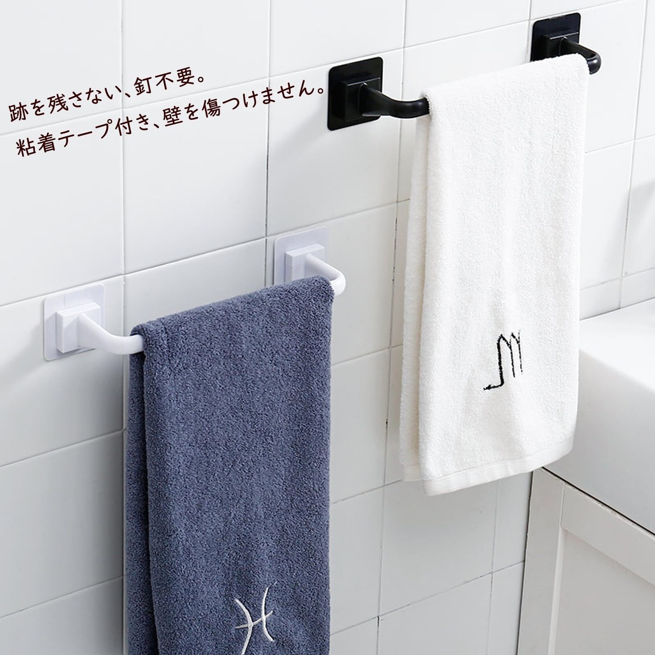 【商品仕様】商品名:タオル掛け。色: 白、黒。材質: PP素材。特徴: 穴あけないタオルかけ、耐荷重が強い。