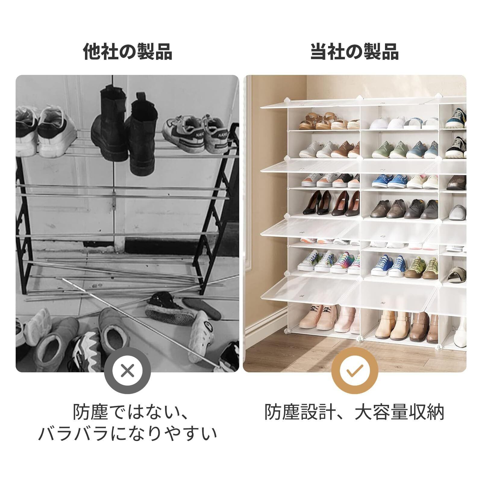 【防水・防塵・防カビ】材質:靴箱は丹念な設計と丹念な製作を経て、精選されたABSコネクタ、PPプラスチック板と防錆鋼フレームを採用した,強度と耐衝撃性を両立させているます。靴収納ボックスはしっかりと固定され、かなり安定しています。環境に優しく耐久性があり、防水、防湿、防カビ、防塵の素材です。毎日のお手入れは、湿らせた布で拭くだけです
