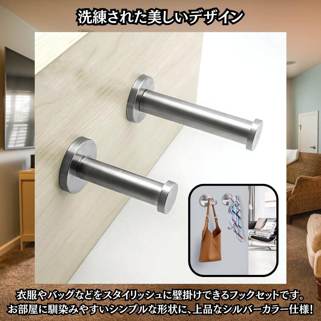 【商品内容】フック:4本 付属:ネジ12個、プラグ12個 素材:ステンレス カラー:シルバー <サイズ(約)> 長さ:152mm フック直径:16mm 重量:60g/個 耐荷重:約5kg(※壁の強度も影響)