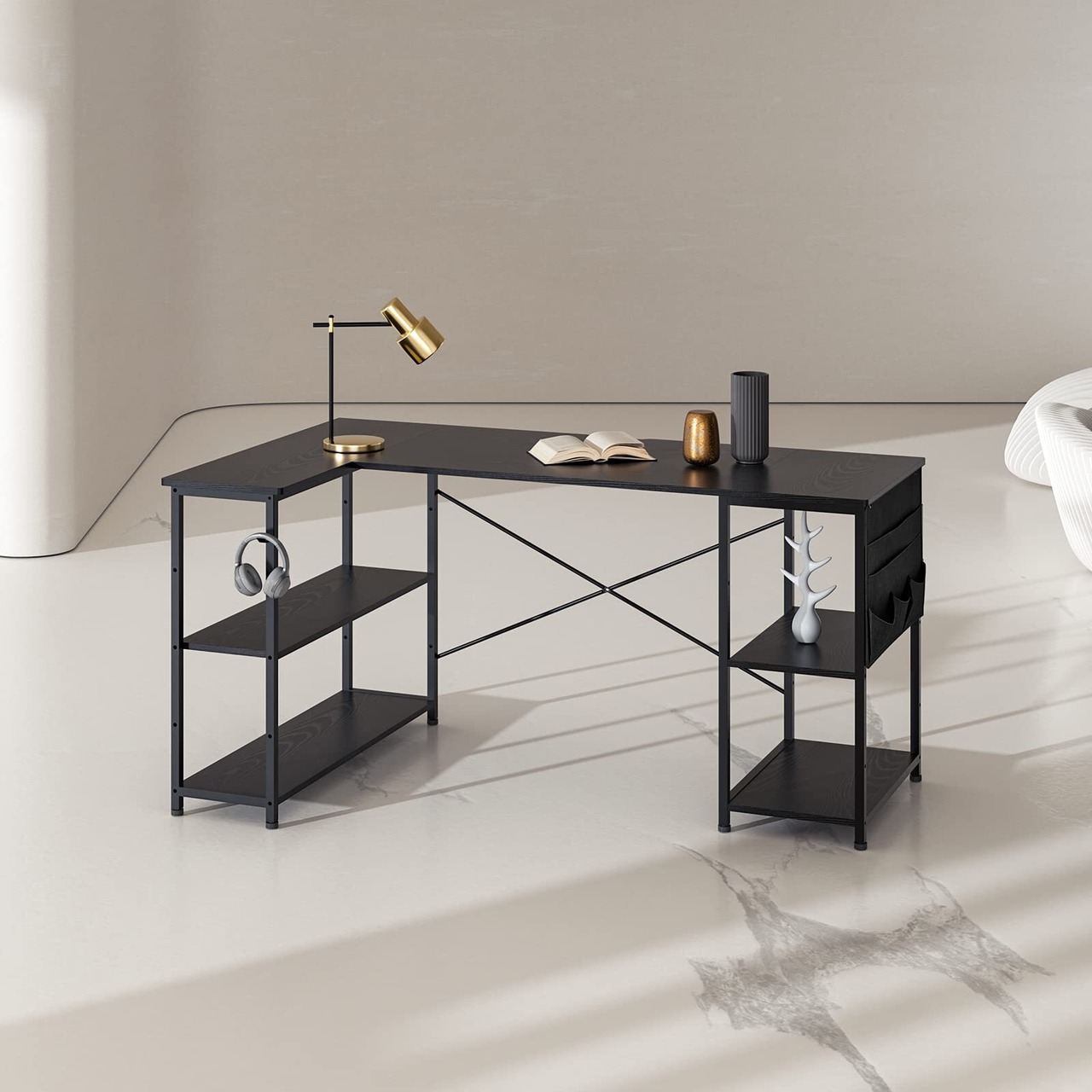 YeTom l字デスク ゲーミングデスク デスク 幅150cm pcデスク コーナーデスク 棚板高さ調節可能 収納袋付き L字型 PC 勉強机 作業 在宅勤務 リモートワーク ゲーム 書斎 収納ラック付き 黑い