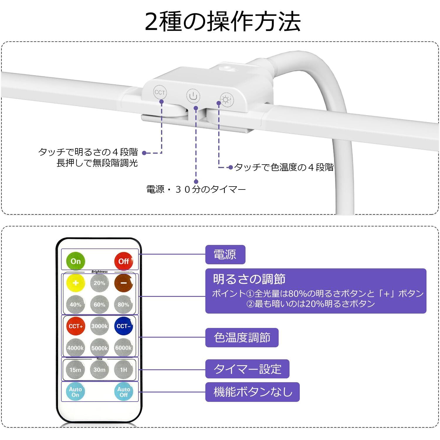 デスクライト リモコン付き スタンドライト 卓上ライト led電気スタンド KableRikaダブル光源 クランプ・タッチパネル・リモコンスイッチ 明るい 強力 最強 タイマー設定 調光調色 寝室・勉強机・仕事 PSE認証済 ホワイト 白 付き