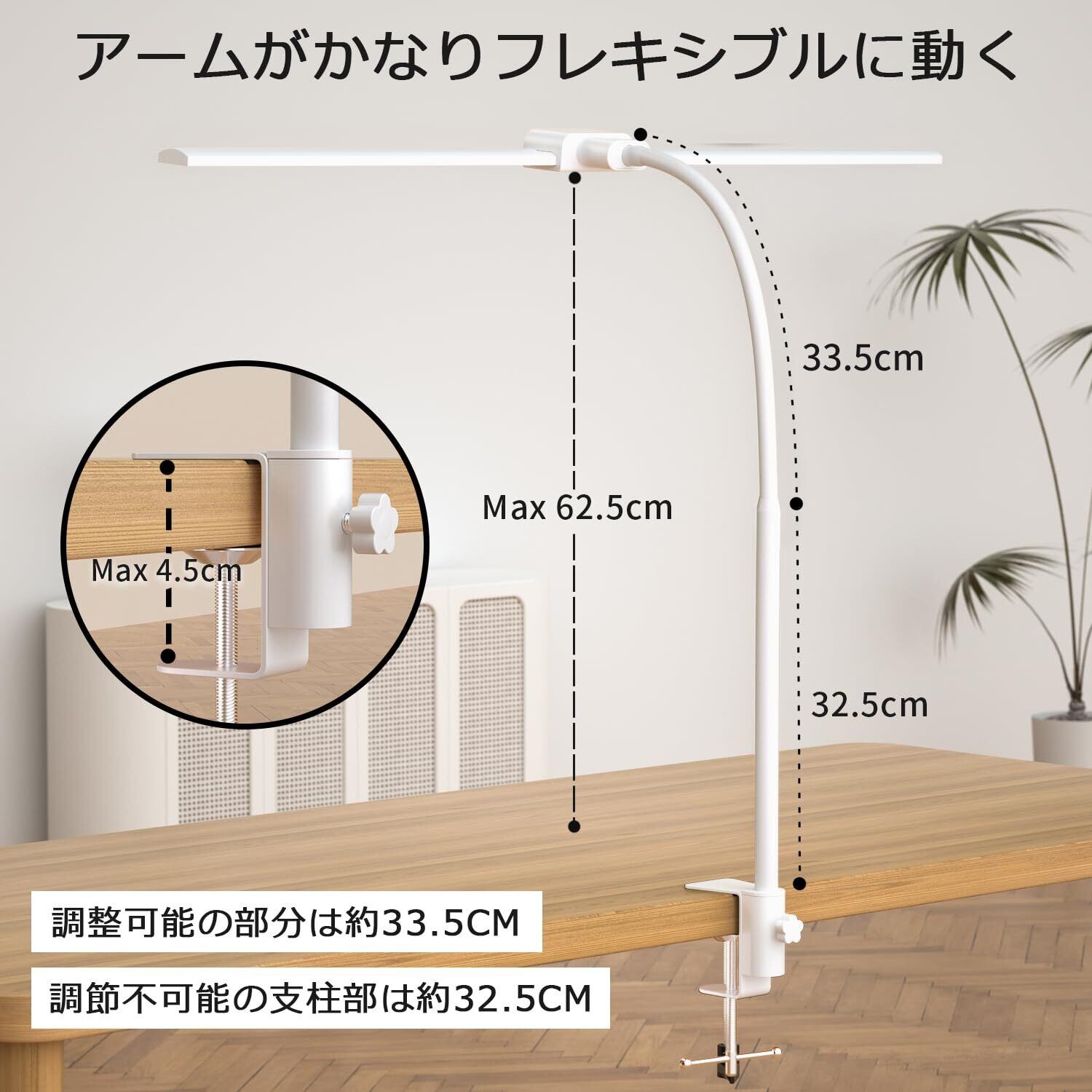フレキシブルアーム&クランプ式:アームは約66cmの長さがあり、上部の33.5cmだけはシリコンとステンレス鋼の素材でフレキシブルに曲がります。クランプの最大挟む厚さは4.5cmまで。離れ離れのクランプはいずれの方向に取付可能。【クランプのネジはとめずに回し続けることができますが、ふさわしい位置で止まれば固定できます。】