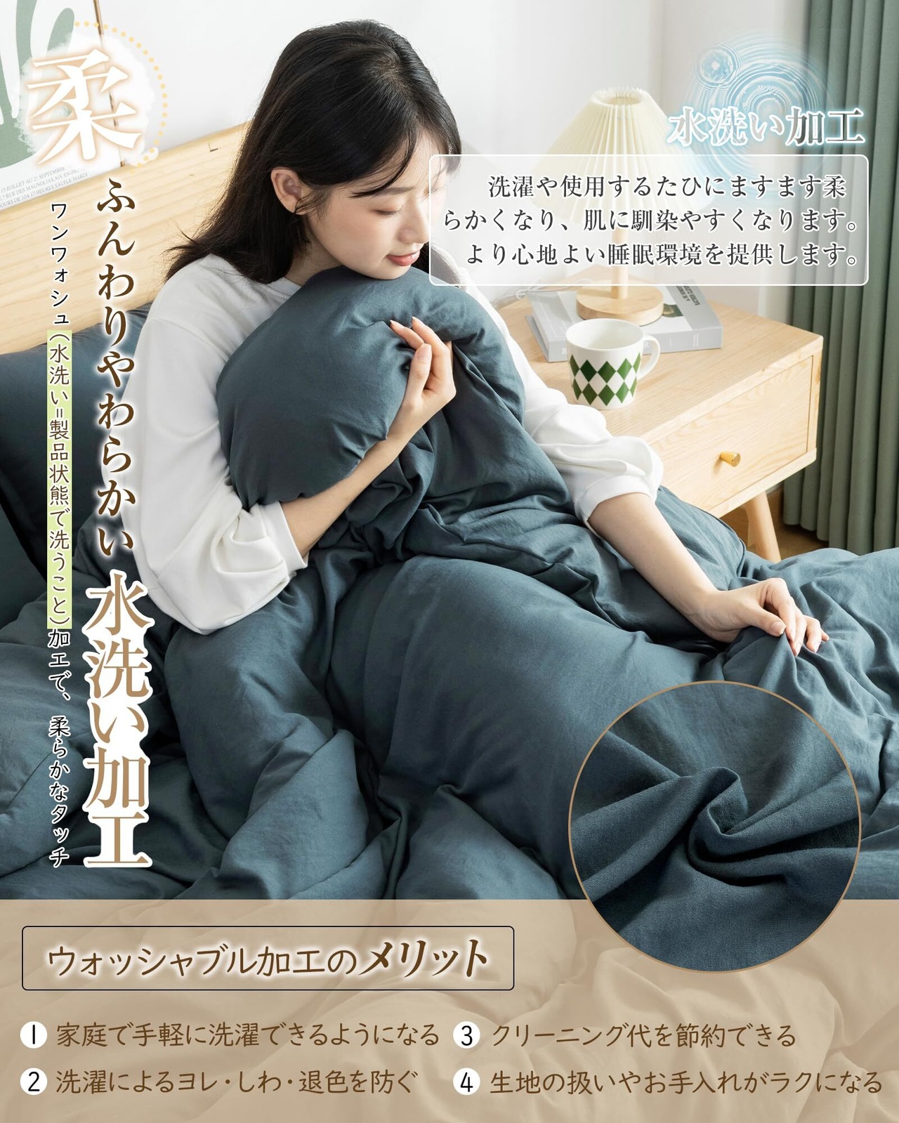 【寝具カバーセット内容・仕様】 ①掛け布団カバー・150x210cm(1枚):片側に丈夫な210cm長さのファスナーを使用、布団留め紐8ヶ所付き。②ボックスシーツ・100X200+30cm(1枚):全周ズレ防止ゴム付き、高さ3-28cmの敷き布団とマットレスの底まで包むことが可能。 ③枕カバー・45X65cm(1枚):ファスナー付きで出し入れが簡単です。※表記サイズより多少小さくなる可能性があります(キルティング製品許容範囲+5%-3%) 。「洗い加工」を施されたポリエステル100%の素材で、洗濯や使用するごとにさらに柔らかくなり、肌馴染みも良くなります。