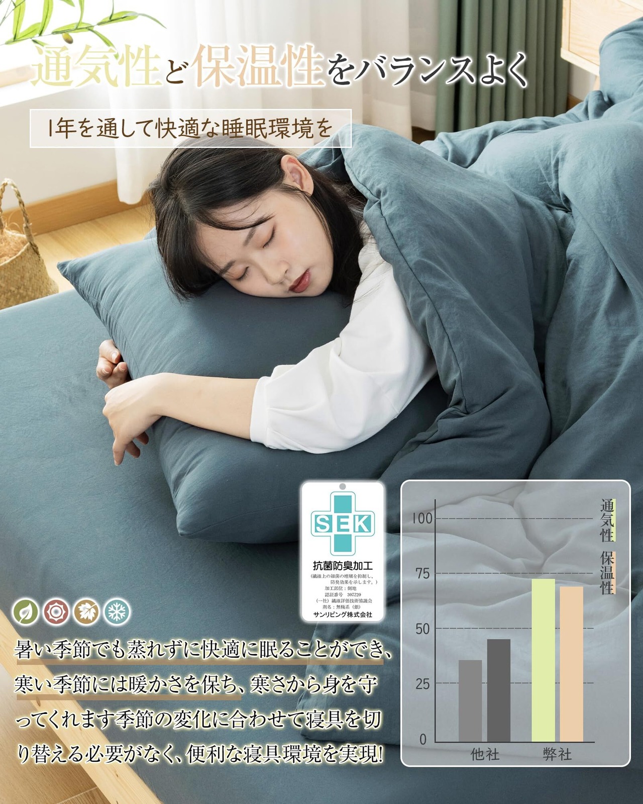 【オールシーズン&和洋通用の仕様】通気性と吸放湿性優れて、夏の場合は、就寝中にかいた汗を吸い取ったり、発散してくれるのでいつでもサラサラとした肌触り。冬の時、カバーの繊維と繊維の間に暖かな空気をためてくれるので、布団の中を暖かく保ったりするという役割もあります。オールシーズン快適な寝心地が楽しめます。和洋どんなテイストのお部屋にも馴染みやすい。自家用でも、ご両親、友人にプレゼントとしてもおすすめします。洗い替え用、来客用としては最高です。