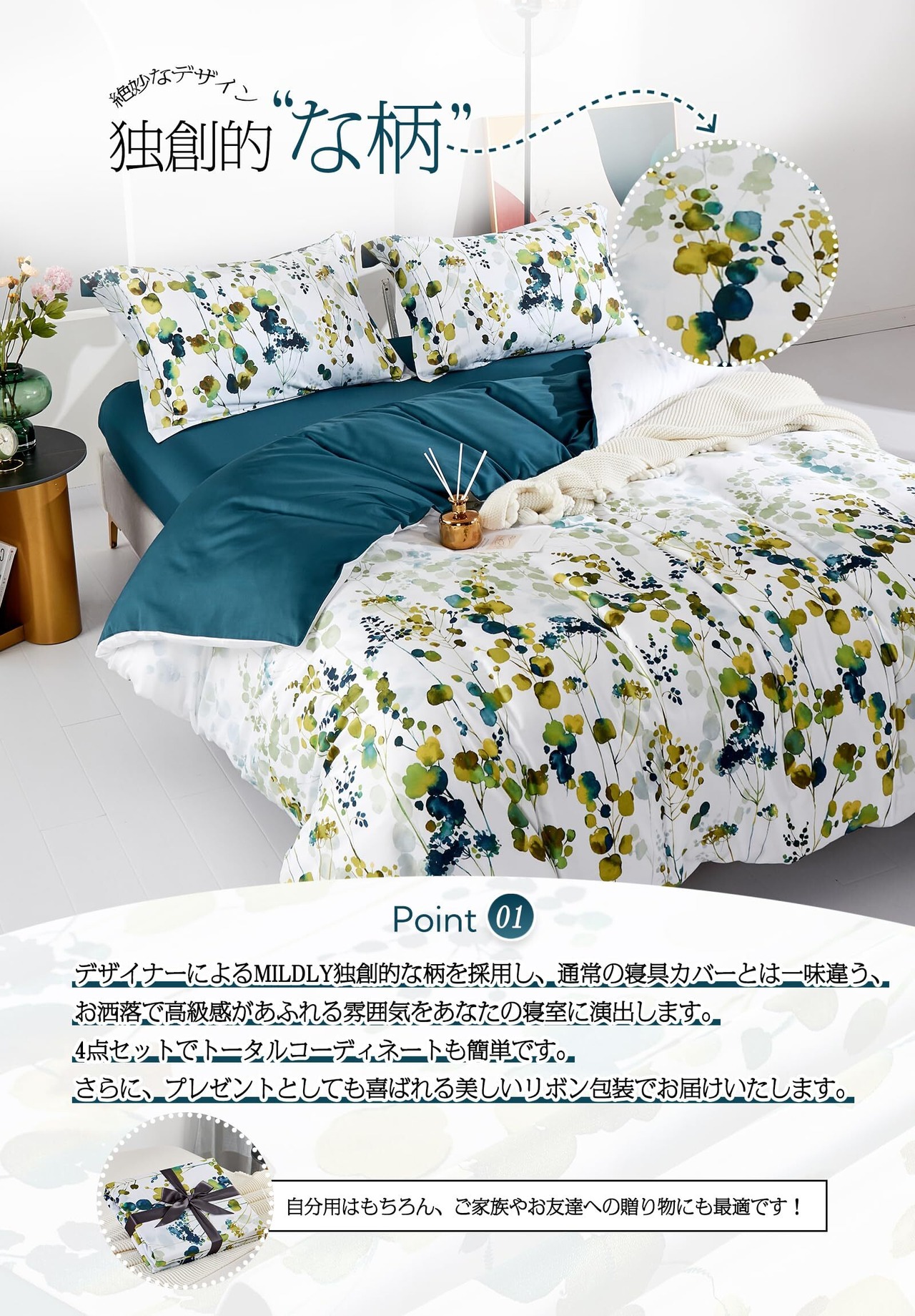 【独創的な花柄】デザイナーによるMILDLYの独創的な柄を採用し、通常の寝具カバーとは一味違い、おしゃれで高級感が溢れる雰囲気をあなたの寝室に演出します。4点セットでトータルコーディネートも簡単です。また、プレゼントにも喜ばれる美しいリボン包装が施されています。自分用に、ご家族用に、お友達への贈り物にも最適です。