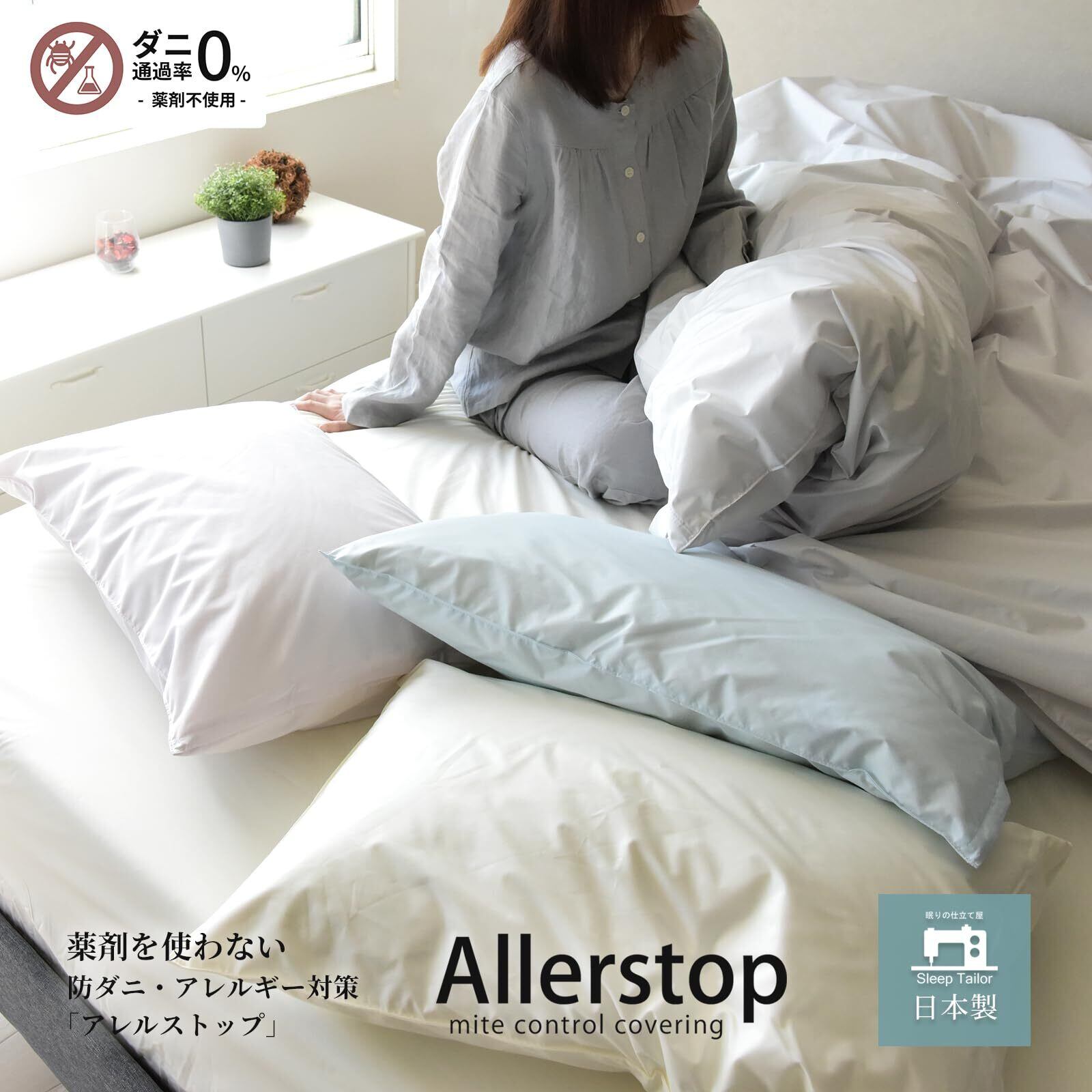 大切な身体を、薬品を使わずダニから守る「Allerstop/d・cut」は、アトピー・アレルギーの方におすすめです。使用生地は、超極細繊維を高密度に織り上げており、ダニやほこり(ハウスダスト)は入り込むことができません。また、縫製にもこだわっており、ミシン目を非常に細かくしてあります。これで、ほとんどのダニの侵入を防ぐことが出来ます。防虫剤などの薬品は一切使用していませんので、お子様やお年寄りにも安心です。生地を高密度に織り上げているため、表面の凹凸が非常に少なく、ホコリやペットの毛がつきにくく、手でサッと払えば落ちてしまうほどです。また、静電気の帯電も少ないので、乾燥した季節でも安心して布団に入ることができます。 ポリエステル80%、綿20%。コットンを適量混合する事により吸湿面をカバーすることで、機能面と吸湿性に優れ、使用感の気持ちの良いカバーになりました。
