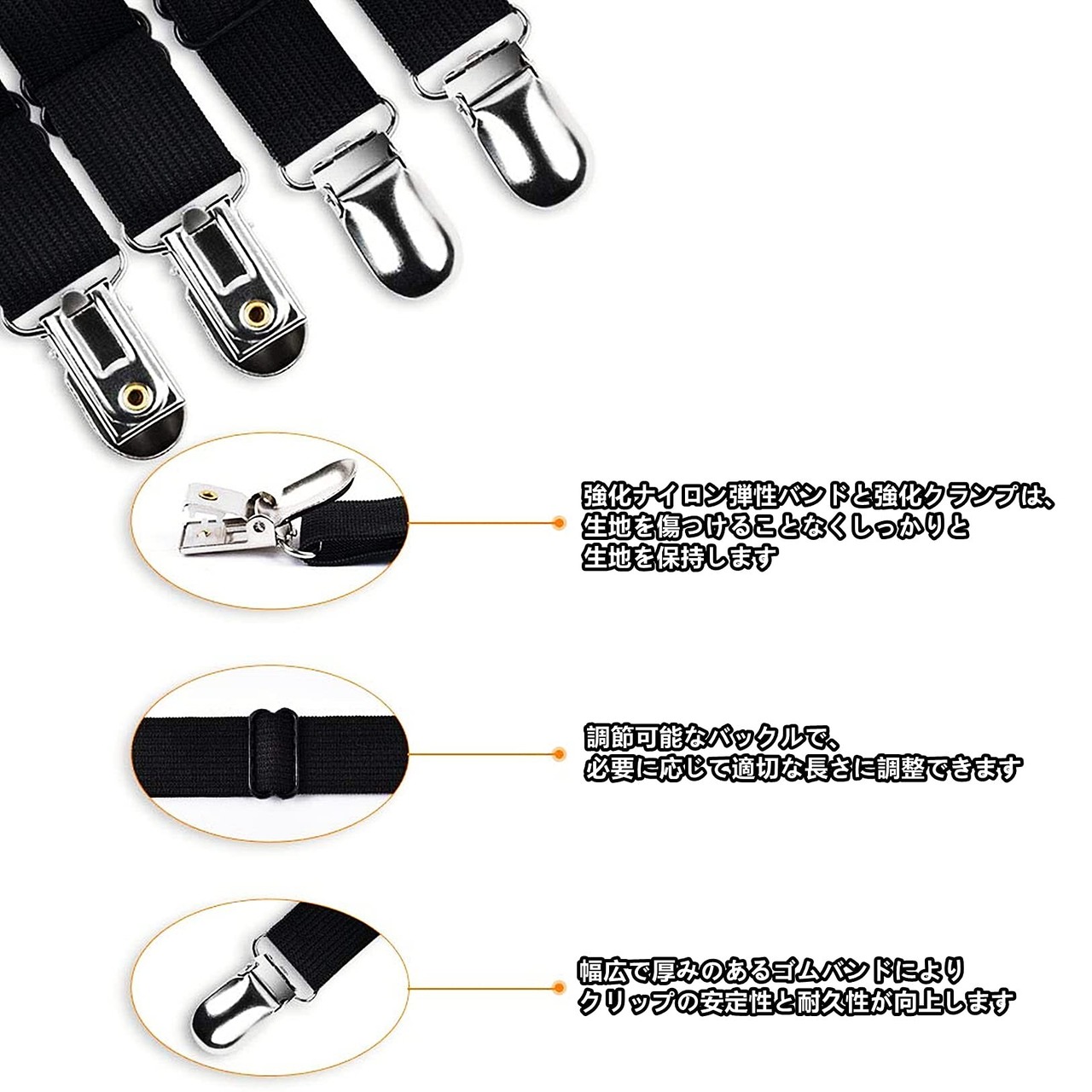 【材質】:高品質の弾性バンド+ PPバックル+金属クリップ。高品質の伸縮性ストラップは強くて長持ちするグリップを提供します。よくできたクロム製のクリップは持続可能で、簡単には壊れません。高品質な材料を採用して、耐久性に優れ、無害で無臭な素晴らしい製品です。