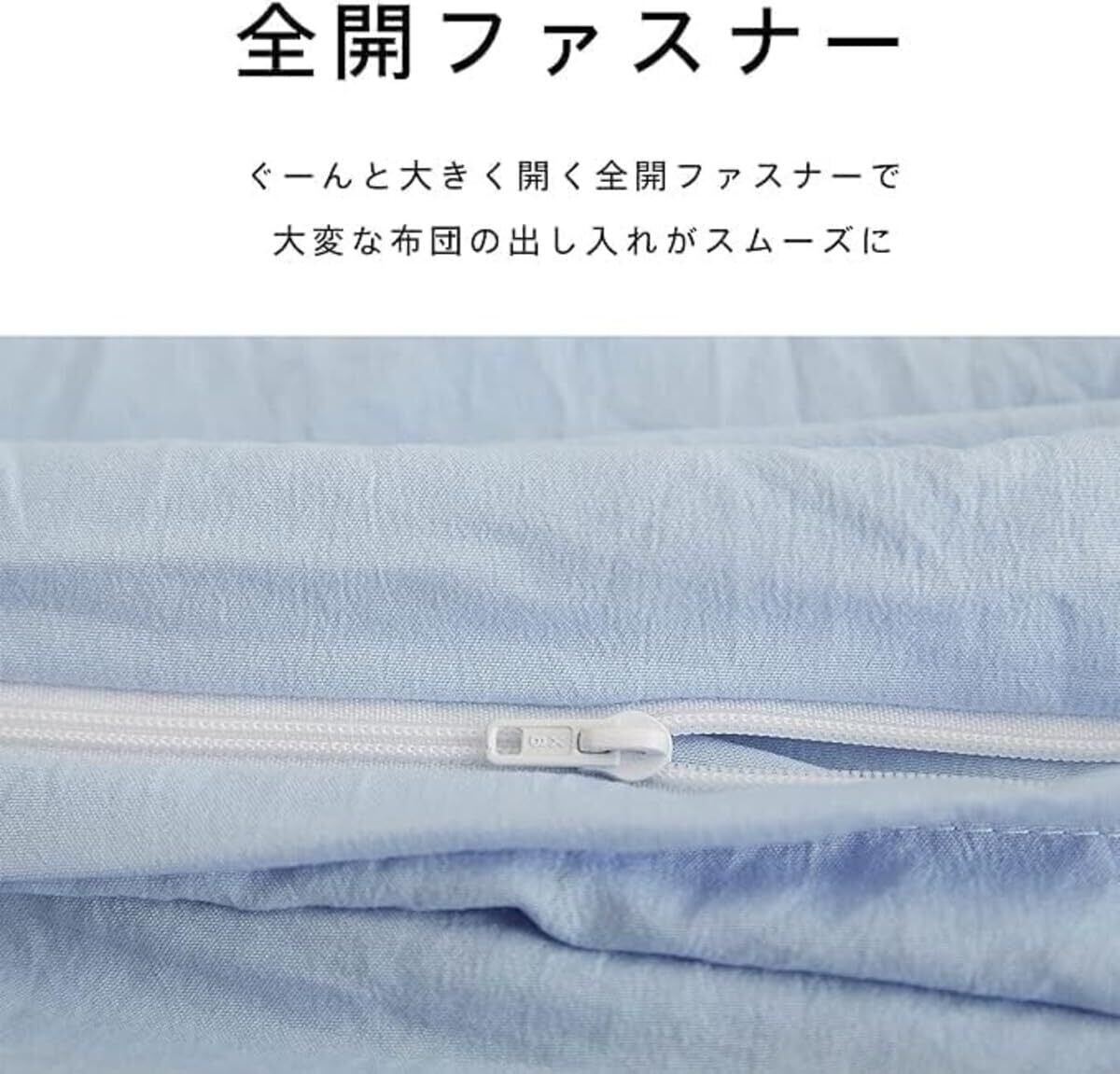 【使いやすさ】当商品は使いやすさにこだわりカバーの片側側面に全開ファスナーをつけました。ぐーんと大きく開くので大変なふとんの出し入れがスムーズにできます。また、スリットを2箇所いれました。スリットから手を入れて布団を持つと簡単にカバーを被せることができます。(スリットは掛けカバーのみです)