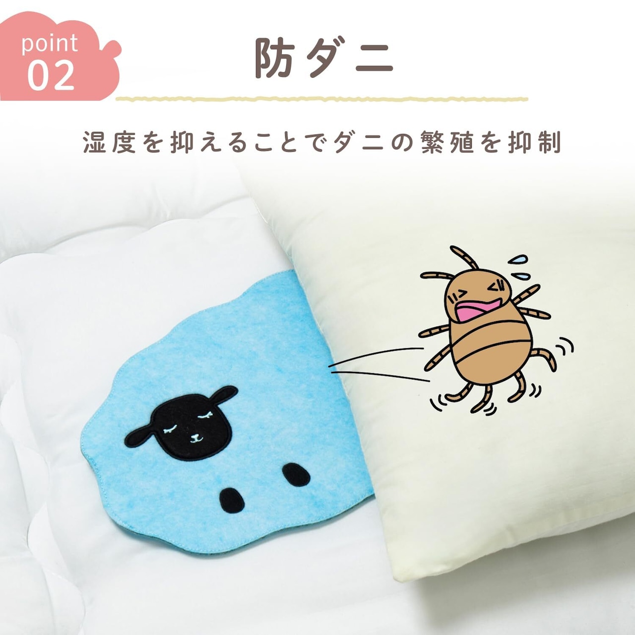 ●湿気を吸っても天日干しで吸湿性能は回復。繰り返し使えて経済的。眠気を誘うヒツジの癒しデザイン。