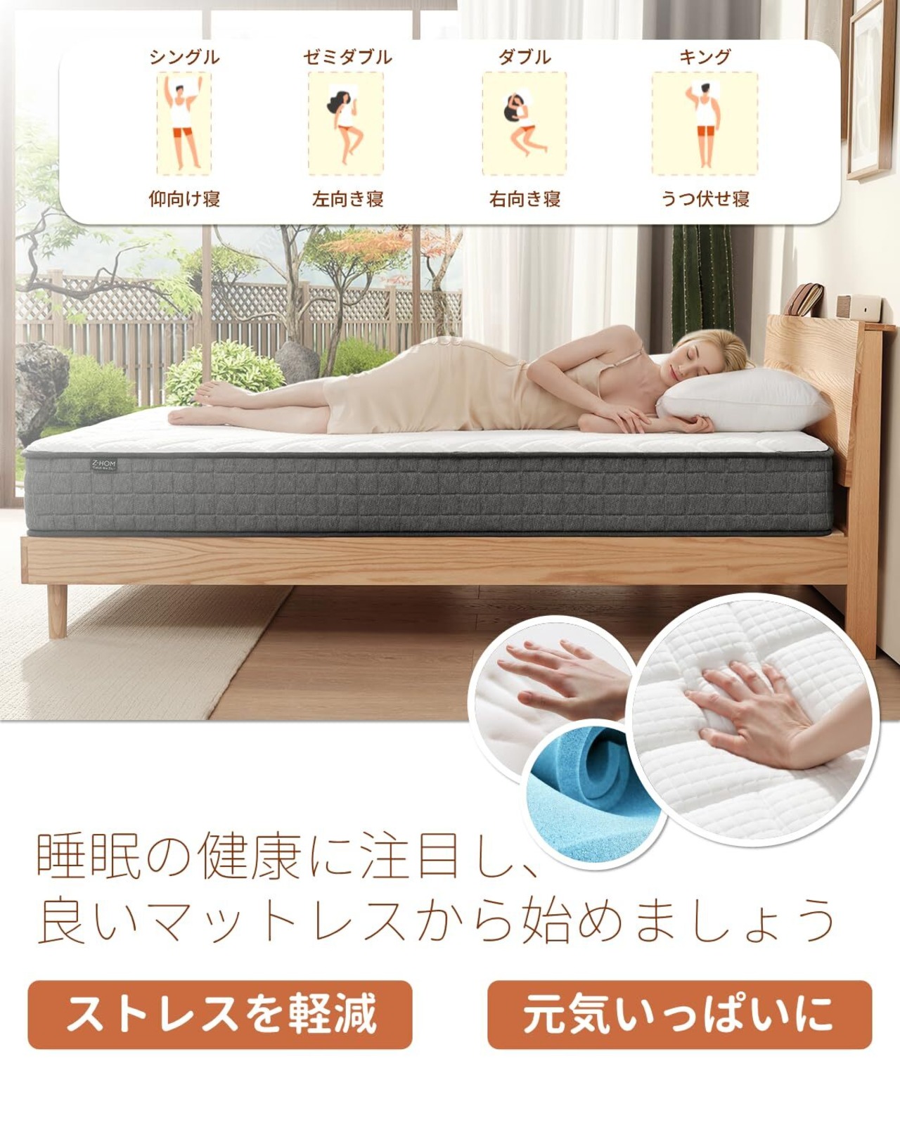 【高密度ウレタンフォーム】:マットレスは、耐久性に優れた高密度の高反発ウレタンフォームを中間層に採用しており、長時間にわたって形状を維持し、変形や沈み込みを防ぎ、持続的な快適さを提供します。また、当社独自の抗菌防臭加工を施した低ホルムアルデヒドのマットレス生地は、通気性が高く、快適な睡眠をサポートします。