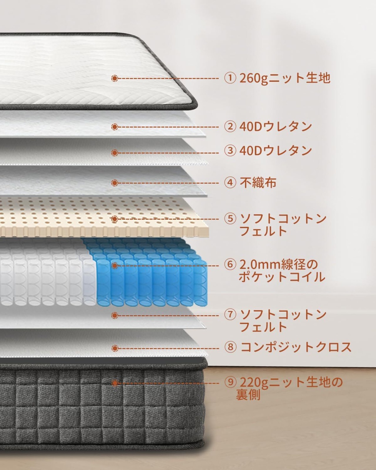【並行配列ポケットコイル】:522個やや硬めの高級袋入り独立コイルスプリングを使用しています。並行配列で各コイルは体の異なる部位を個別にサポートし、精密なサポート力を提供します。独立したポケット包装により、コイル間の干渉を減らし、静かな睡眠環境を実現します。