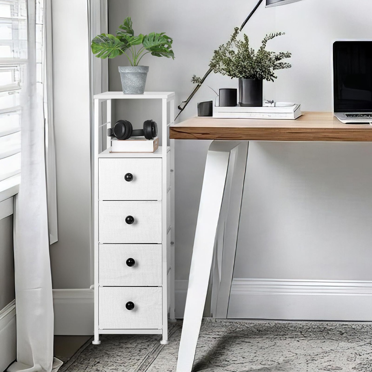 サイドテーブル スリム 白 4つ引き出し付き 寝室 布製引き出し サイドチェスト 木製天板付き ナイトテーブル 北欧 4段 収納チェスト おしゃれ 北欧 電話台 ベッド横 ベッド周り収納 転倒防止 一人暮らし