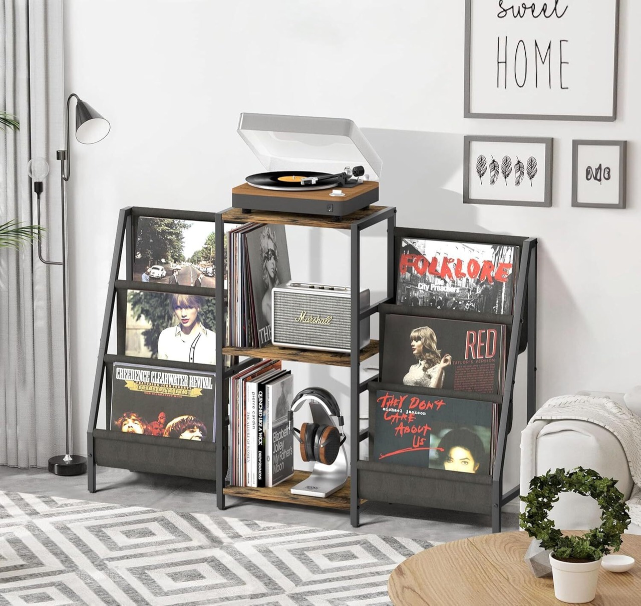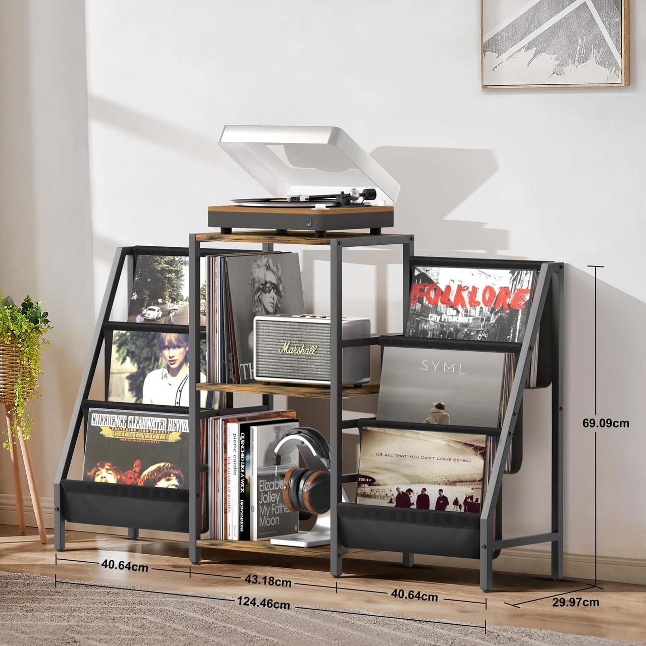 【高品質なレコードプレーヤー収納】高級で耐久性のある粉体塗装の金属フレームは錆を防ぎます、高品質で厚みのあるお手入れ簡単な木製ボード、そして高級オックスフォード生地が安定したサポートを提供し、長年にわたる使用をします。