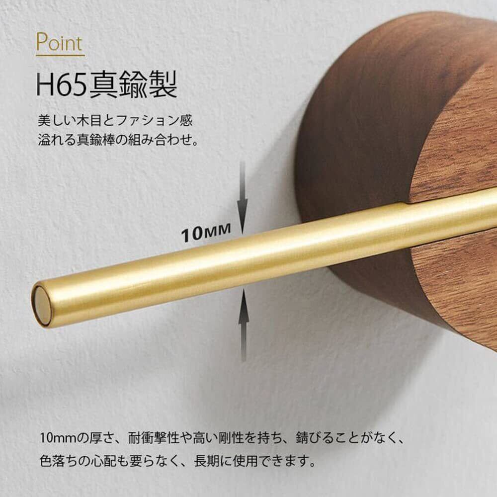 真鍮棒:天然の黒クルミ材を使用しているので、あらゆるインテリアテイスト、場所にマッチします。掛けるものの大きさに合わせて、真鍮棒を左右に調整します。 真鍮棒を支持部に差し込みます。