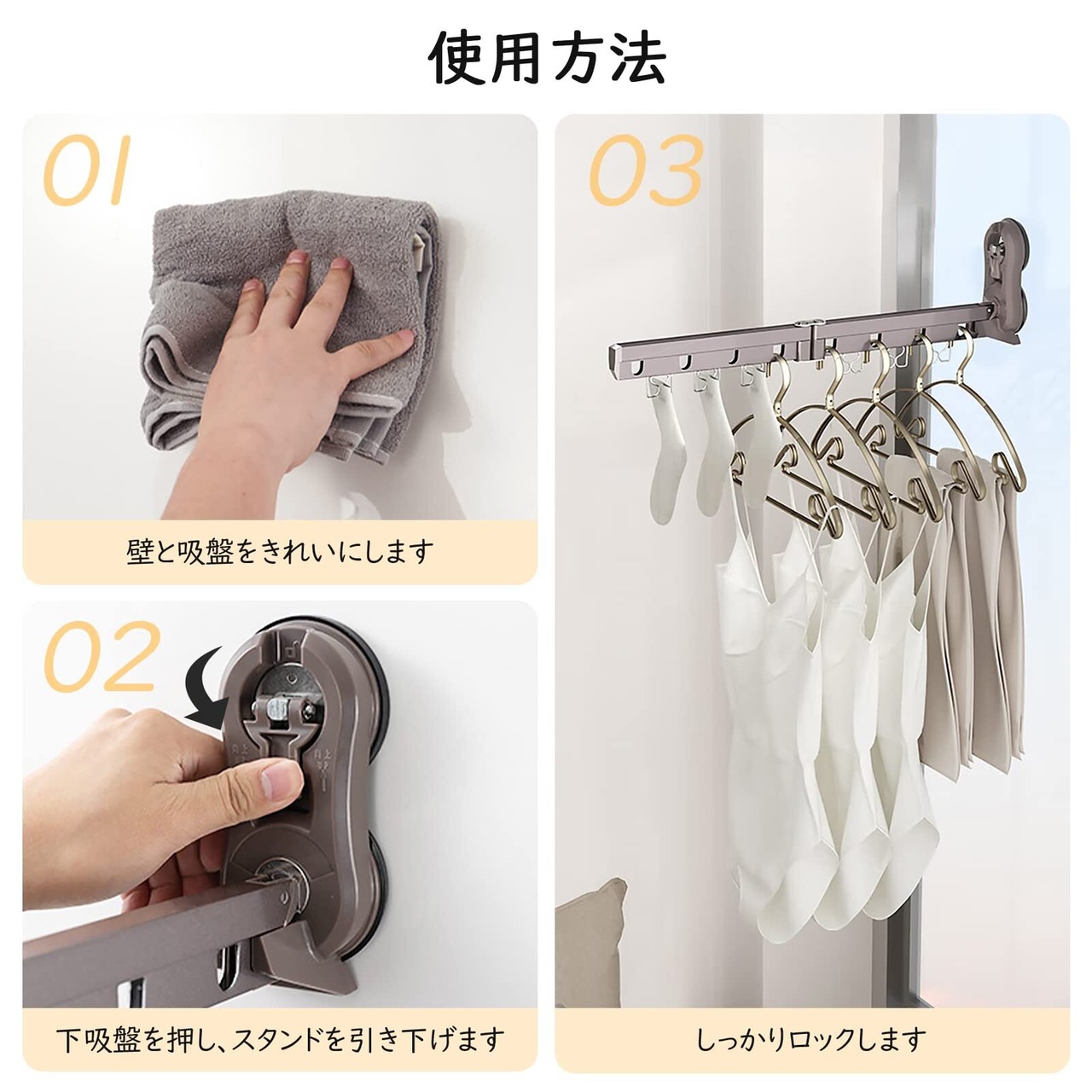 【用途が広い】コンパクト&軽量設計で持ち運びに便利な点も特徴です。壁面のデッドスペースを有効活用し、すっきりとした空間を保てます。吸盤式なので簡単に取り付け、取り外しができ、壁を傷つけずに繰り返し使えます。強吸着力のため、ガラスやタイルなどの壁面で使用可能。賃貸物件やバルコニーがない場所でも手軽に使用できます。旅行時、ホテルのバスルームやルームで、ガラスに貼り付け、衣類を掛けたり、衣類を乾かしたりできます!