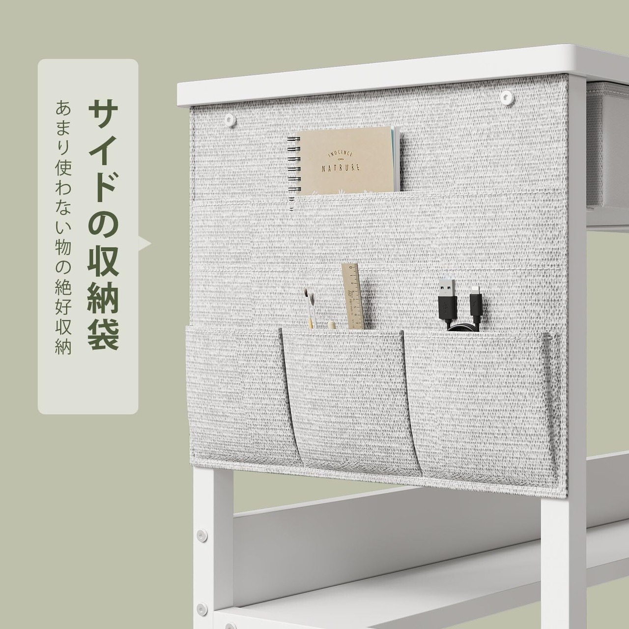 【便利なサイドポケット付きデスク】デスクの側面には収納ポケットが付いており、スマートフォンやリモコン、ノートなどの小物を手軽に収納できます。スペースを有効活用し、使い勝手が向上します。