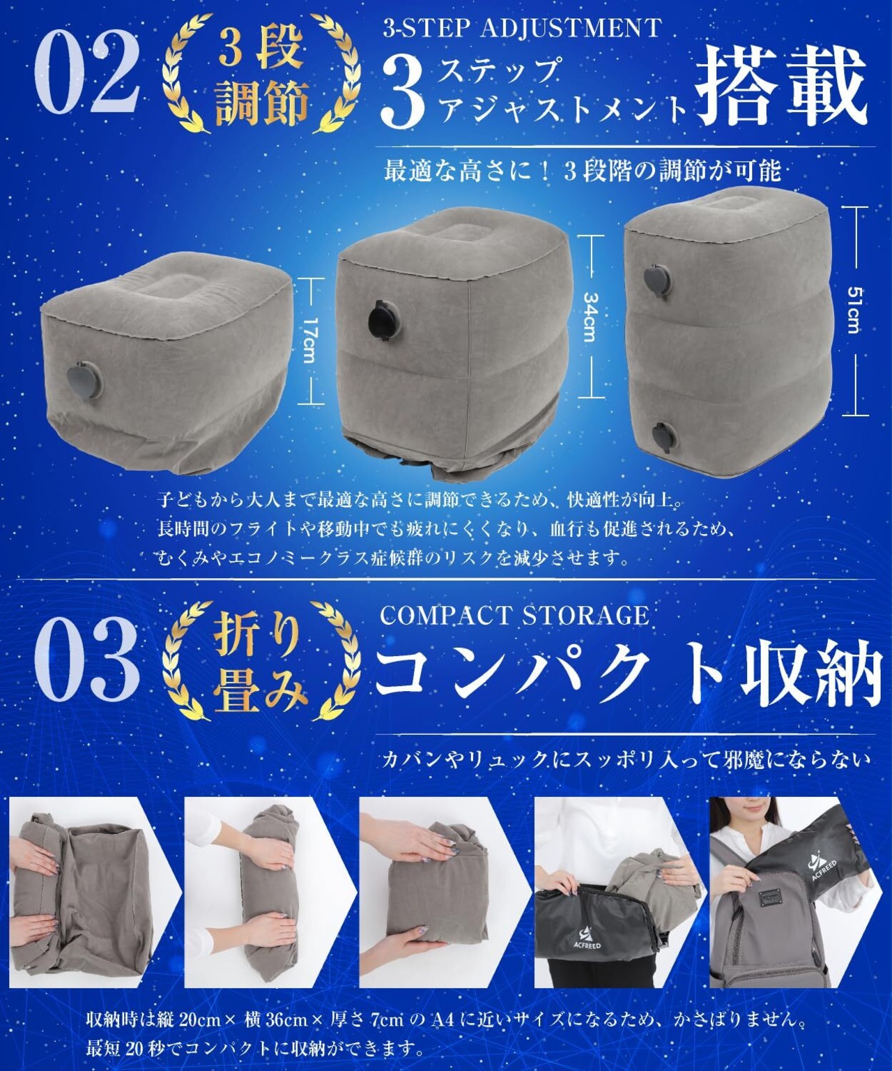 ✈️【3ステップアジャストメント搭載】最適な高さに!3段階の調節が可能。子どもから大人まで最適な高さに調節できるため、快適性が向上。長時間のフライトや移動中でも疲れにくくなり、血行も促進されるため、むくみやエコノミークラス症候群のリスクを減少させます。本体サイズ:約幅32cm×奥行44cm×高さ17/34/51cm(3段階)