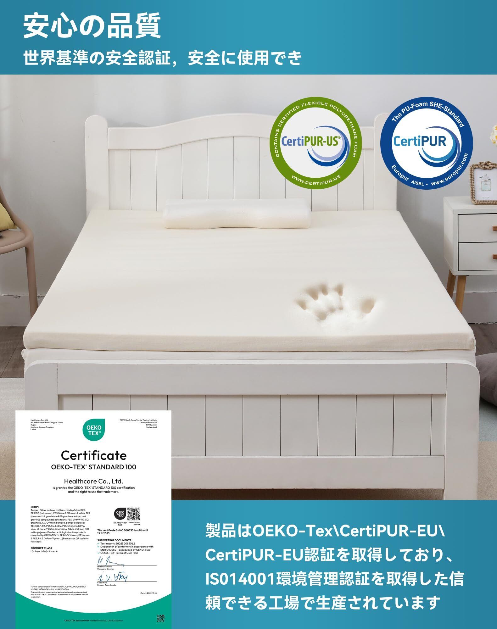 【安全認証】 当社のマットレス高反発の素材は柔らかく快適で、「CertiPUR-US」および「OEKO-Tex」の認証を取得しています。ポリウレタン特有の臭いがありますが、体に害はありません。寝具としての快適性と信頼性を備えたマットレスが、皆様の良質な睡眠をお届けすることを願っております。
