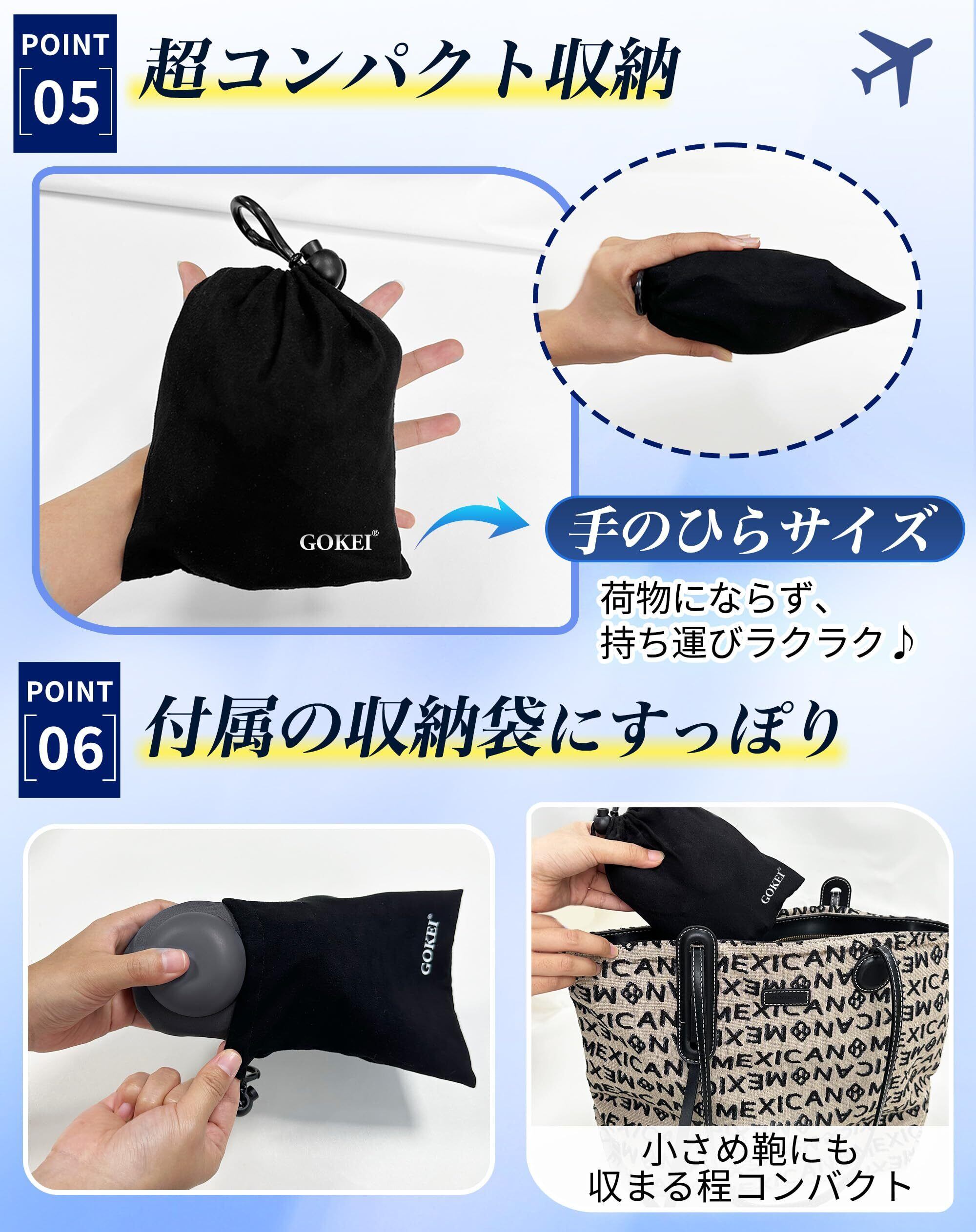 【超軽量&コンパクト、旅を身軽に】重さも約100gと超軽量!空気を抜いて折りたたむと手のひらサイズで荷物にならない!荷物が嵩張らず、快適な移動や旅をお楽しみいただけます。旅行や出張などの飛行機、電車、車移動などに。デスクワーク中の首預け場に。車中泊やお昼寝などの睡眠時などには携帯枕としても大活躍!機内で寝るときに首がストンと落ちて目が覚めることはありません。