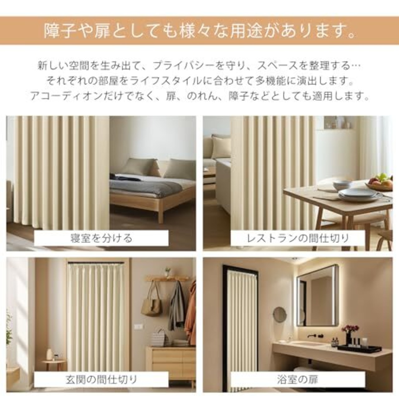 【適用】:部屋、階段、玄関、リビング、ドア、キッチン、脱衣所などいろいろな場所で使える。新しい空間を生み出すことができる。さらに、きちんとプライバシーを守れる。