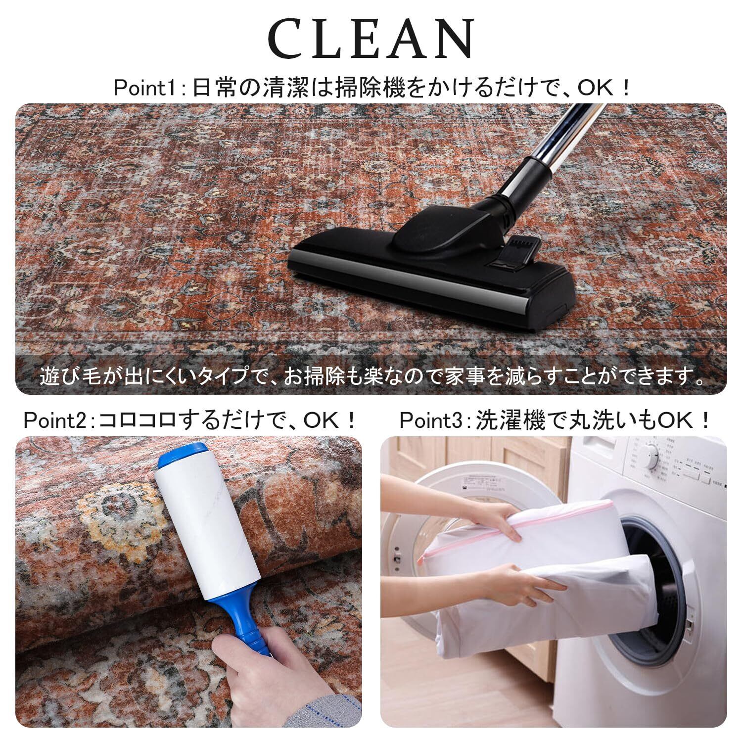 【洗濯機で洗える】密度が高くて短めの毛足はゴミが絡みにくく、日常の清潔は掃除機をかけるだけで、OK!汚れた場合は手洗いや洗濯ネットに入れて洗濯機で洗うことができます。※ラグは風通しの良いところで陰干しして、アイロン、乾燥機はご使用をお避け下さい。