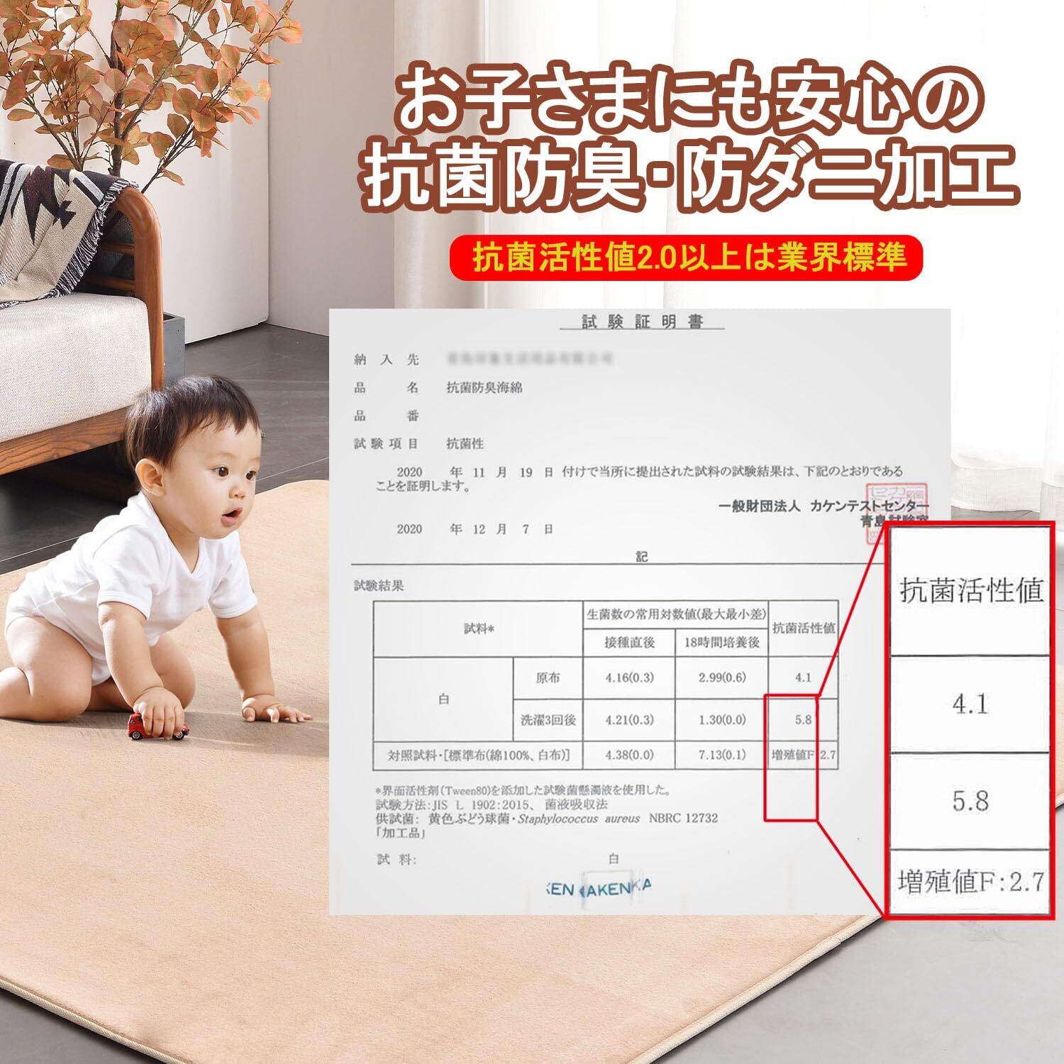 【抗菌防ダニ】ラグマット1.5畳直接肌に触れるものだから、安心・安全にこだわりました。ラグの生地は通気性に優れており、菌の繁殖を抑える「抗菌防臭防ダニ」加工済で、そのため、アレルギーが気になる方や、このカーペット1.5畳安心してご利用ください。
