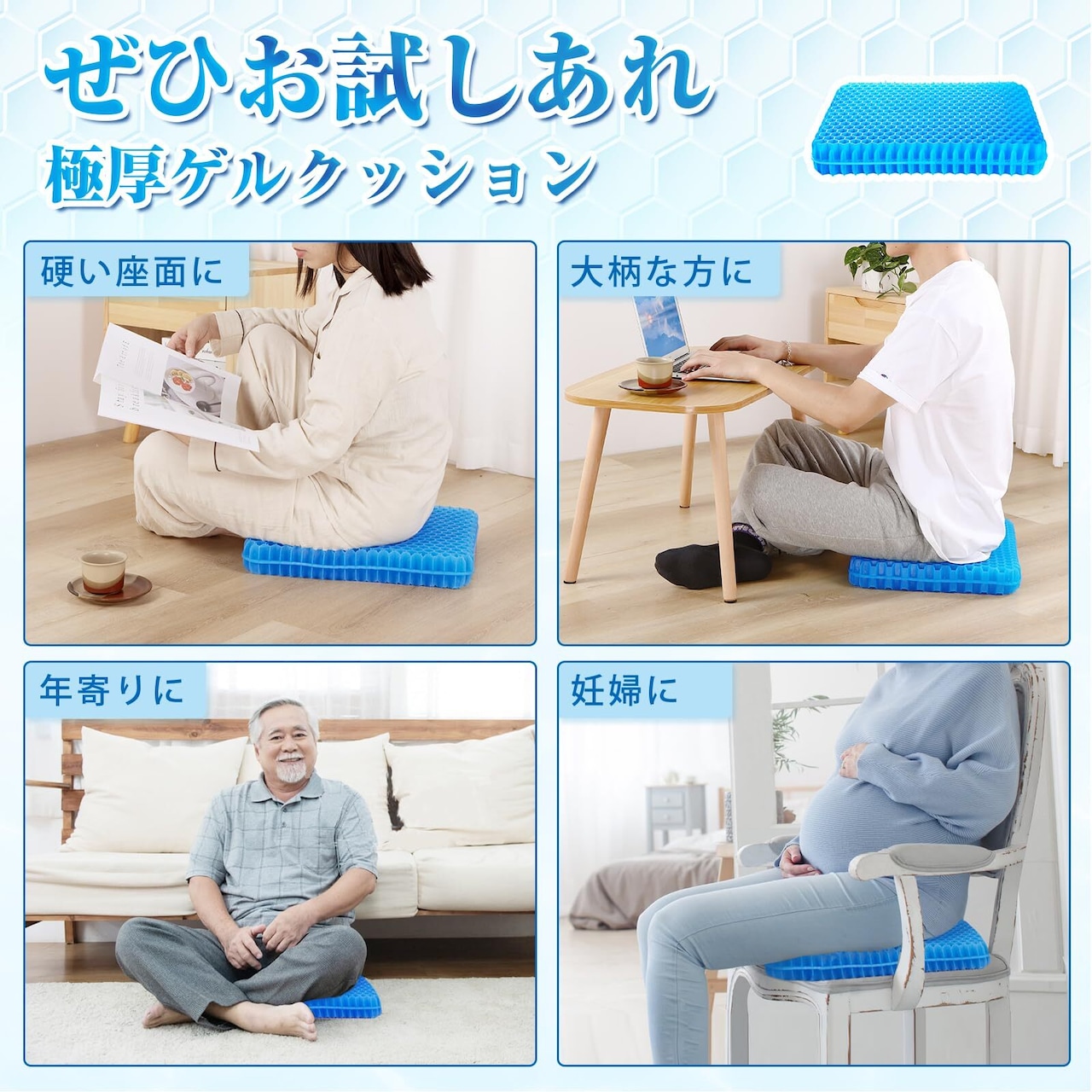 【極厚・贅沢な60㎜】こちらは極厚クッションがお好みの方のために厳選しましたゲルクッションになります。厚さは60mmなので、座ると「おっ、これが無重力か」ってなるほどの厚みと弾力性をもつ一品です。