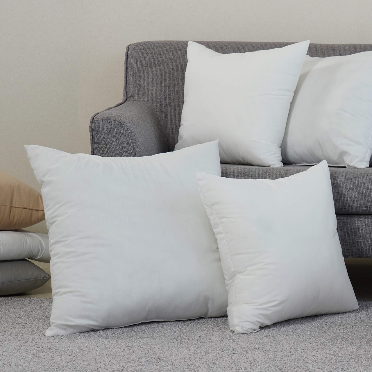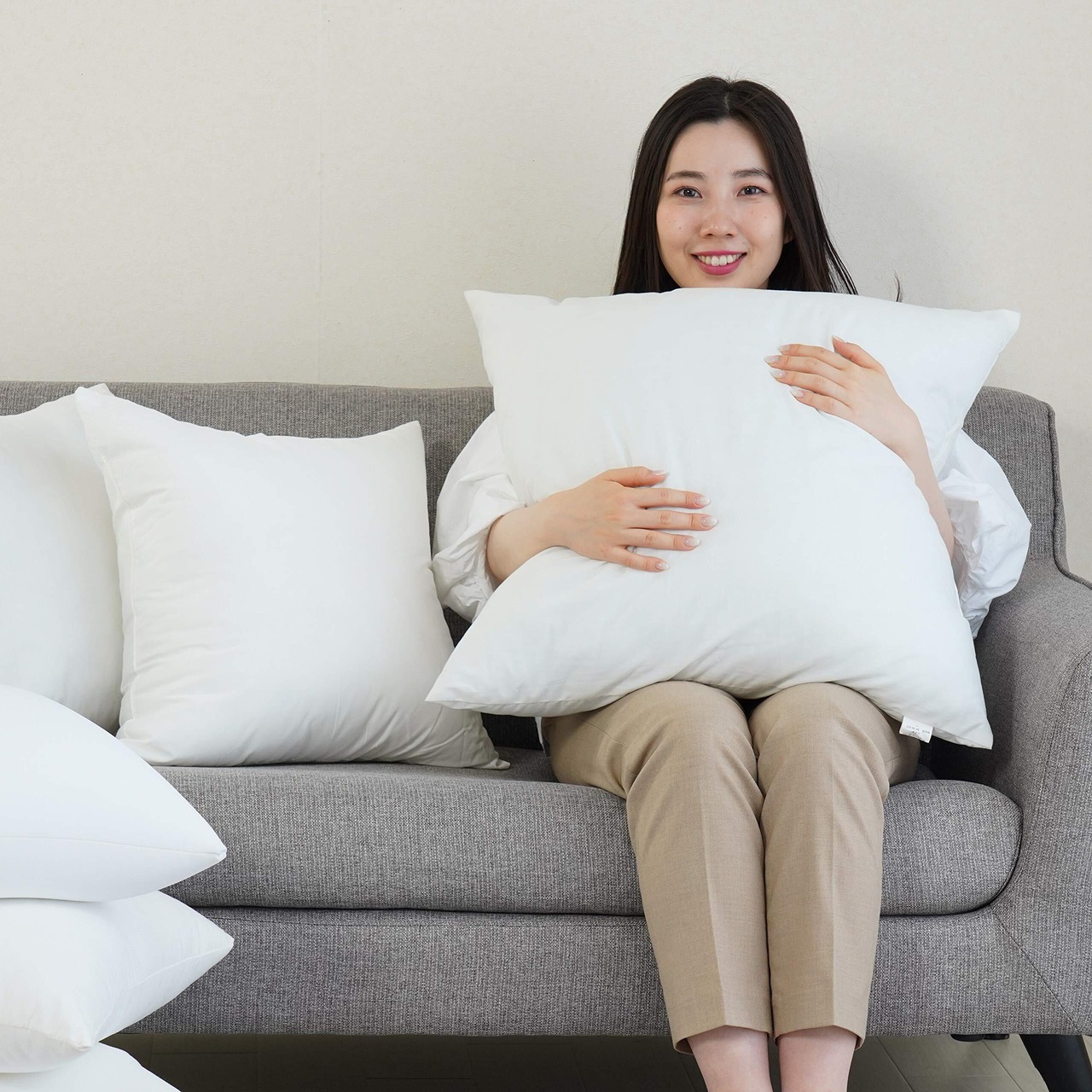 クッションカバー60x60cm用背当てクッションの中身です。輸入再生「ポリエステルわた」を使用しています。お使いのカバーを掛けてお使い下さい。ヘタリが遅く、長くお使いいただけます。