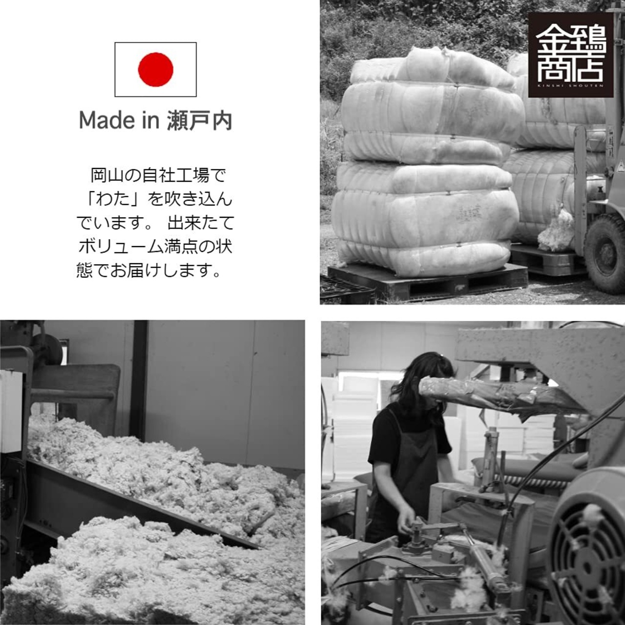 中身 ポリエステル100% ポリエステルわた 海外製 自社で原綿輸入、自社工場で吹き込みしています。
