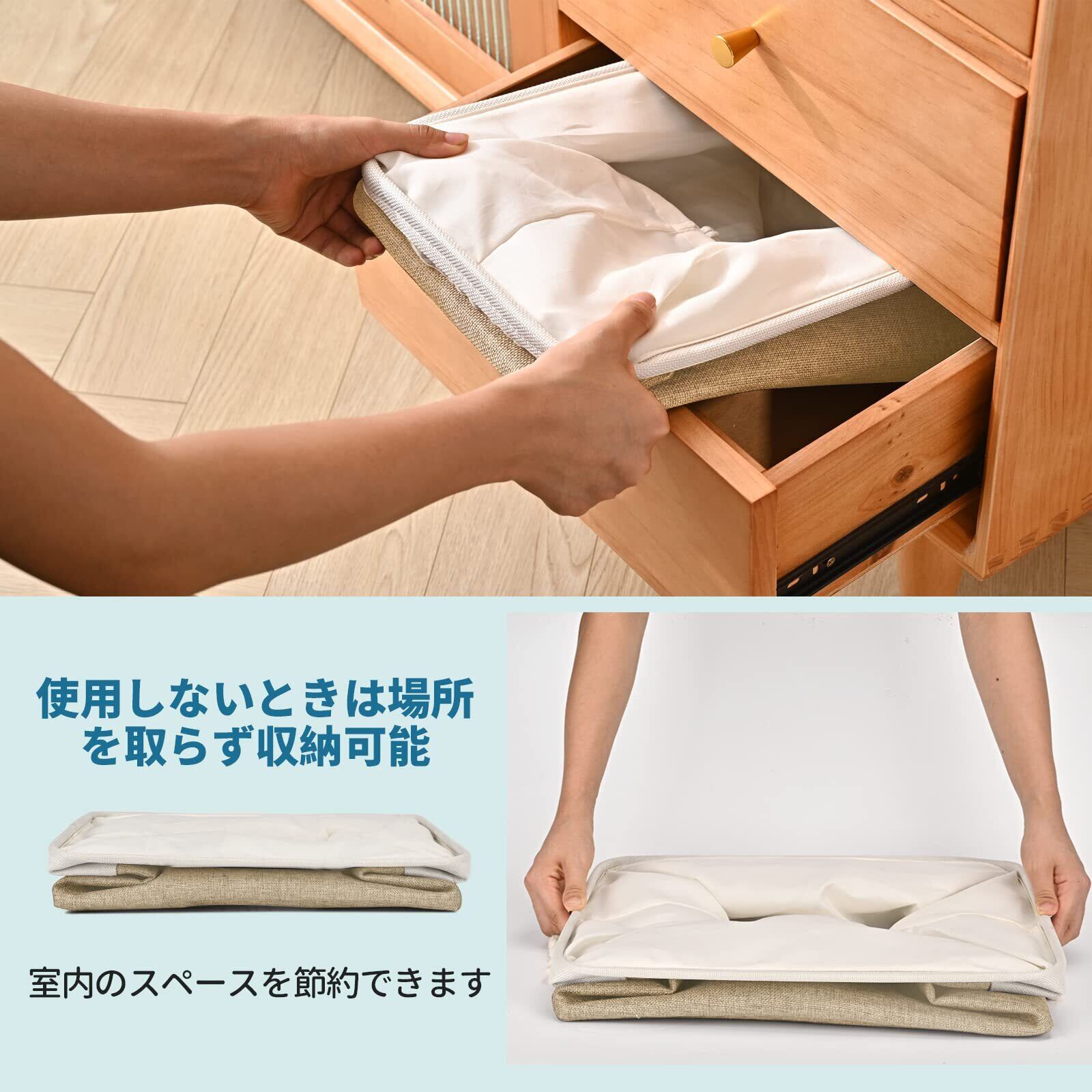 【軽量・折り畳む式】 収納バスケットは折りたたみ式ですからとても省スペースです。使用していないときは平らに折り畳むと簡単に保管できます。軽量ながらも非常に便利で実用的にデザインされています。