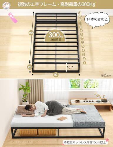【シングルベッドフレームの仕様】■約幅97×奥行195×高さ25(cm)■材質:粉体塗装・すのこ・パイプベッド;本体重量約14.5Kg、耐荷重約300Kg