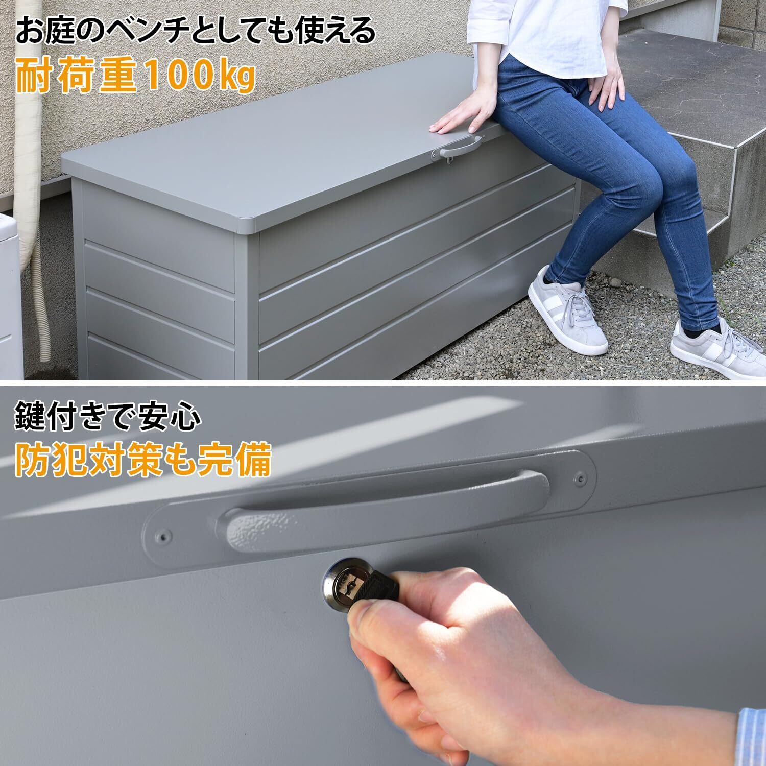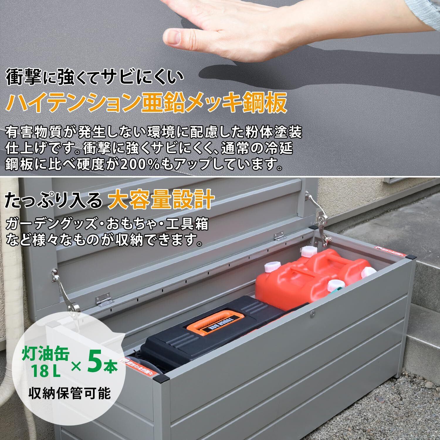 【特徴】ベランダやお庭での保管に便利なスチール製ストッカーです。カラーはグレー[Amazon.co.jp限定]です。ハイテンション亜鉛メッキ鋼板は、有害物質が発生しない環境に配慮した粉体塗装仕上げです。衝撃に強くサビにくく、通常の冷延鋼板に比べ硬度が200%もアップしています。たっぷり入る大容量設計で、灯油缶18Lが5本保管可能です。ガーデングッズ・おもちゃ・工具箱など様々なものが収納でき、ベランダやお庭での保管に便利にお使いいただけます。天板耐荷重100㎏と丈夫なので、お庭のベンチとしても使えます。標準設備に鍵がついているので、防犯対策を気にされる方にもおすすめです(鍵:2本付き)。取付フック2個付き、開閉強度調節、フタを開閉しやすい取っ手付き、ガタ付きを調整できるアジャスターと、細部にまで使い勝手にこだわった機能を搭載しました。