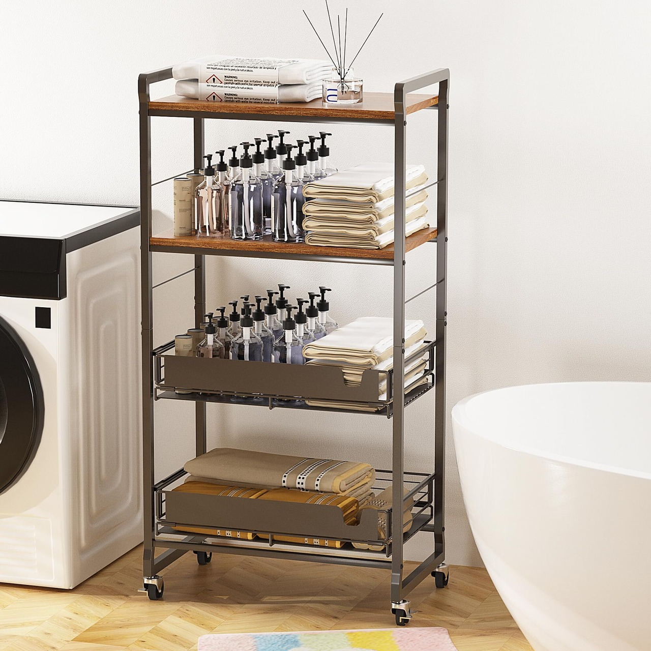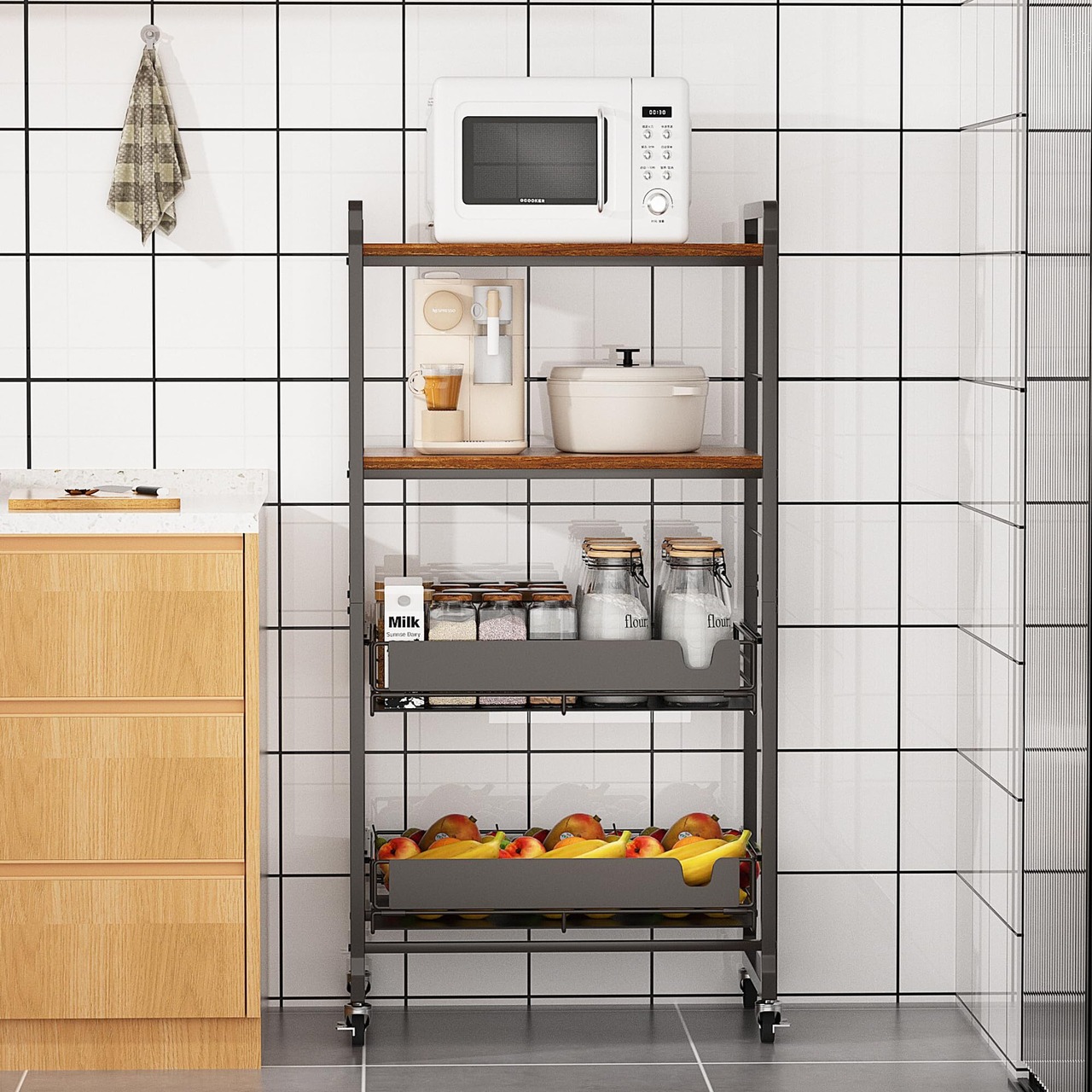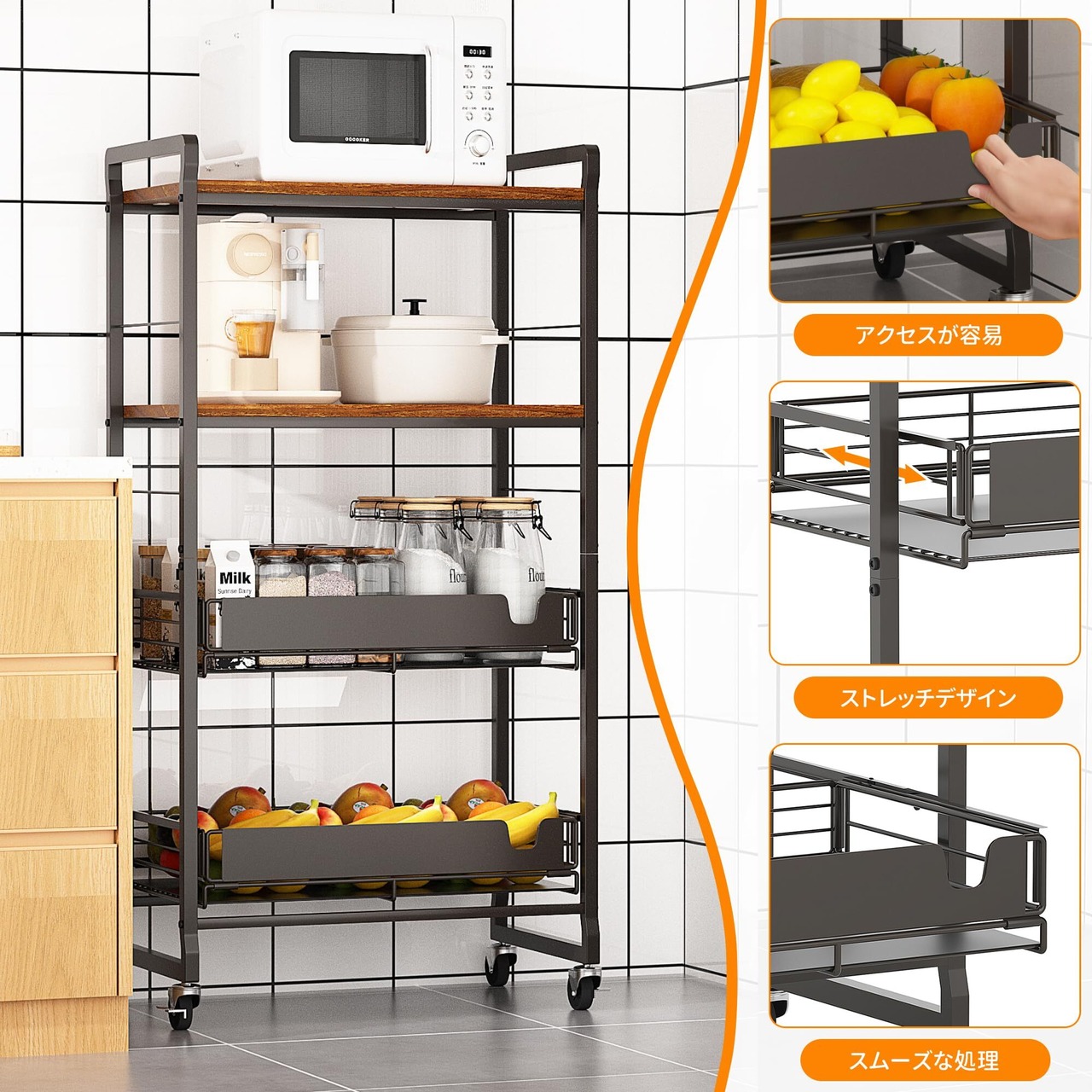【特価商品】TORIBIO キッチンラック 3段式 レンジ台 レンジボード スライド棚 ストッパー付きキャスター 収納 棚 オープンシェルフ (63×33.5×116.5cm TJ-04M)