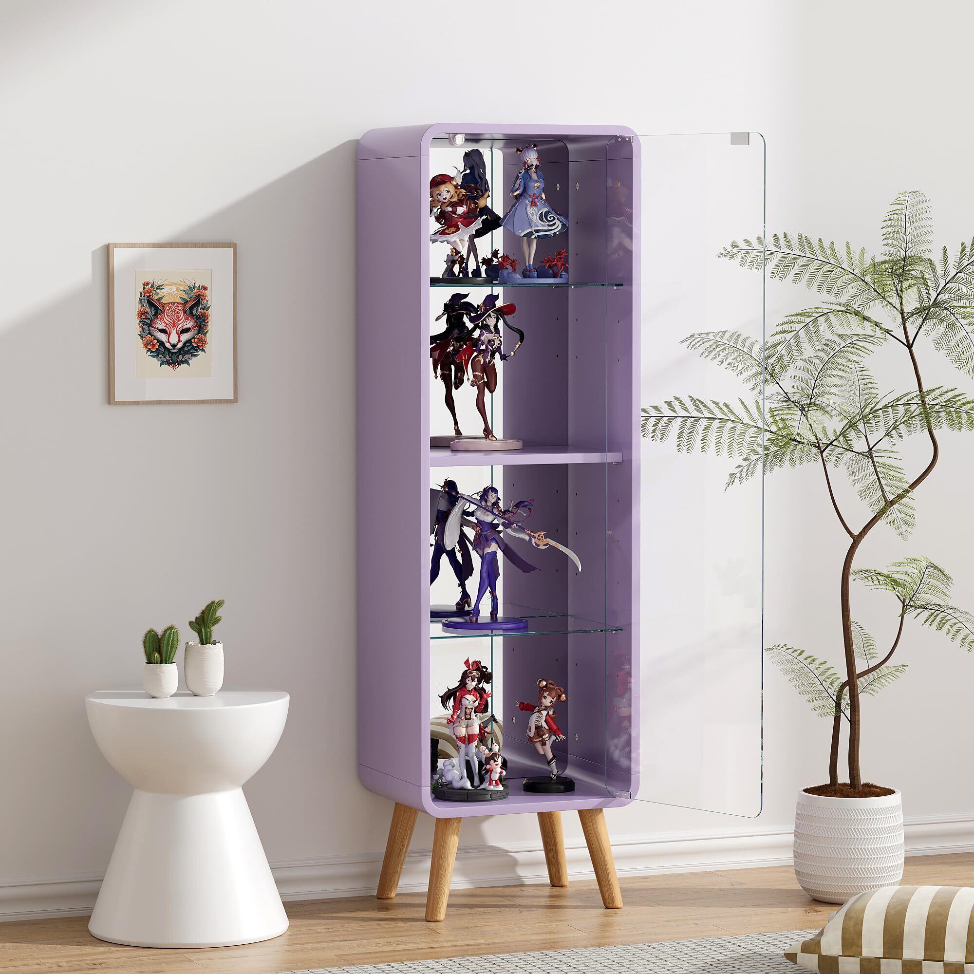 OSJ コレクションケース コレクションシェルフ ガラスディスプレイキャビネット4段 高さ調節可能 フィギュア 収納 背面ミラー 強化ガラス棚 サイズ:幅36*奥行26.5*高さ121CM パープル