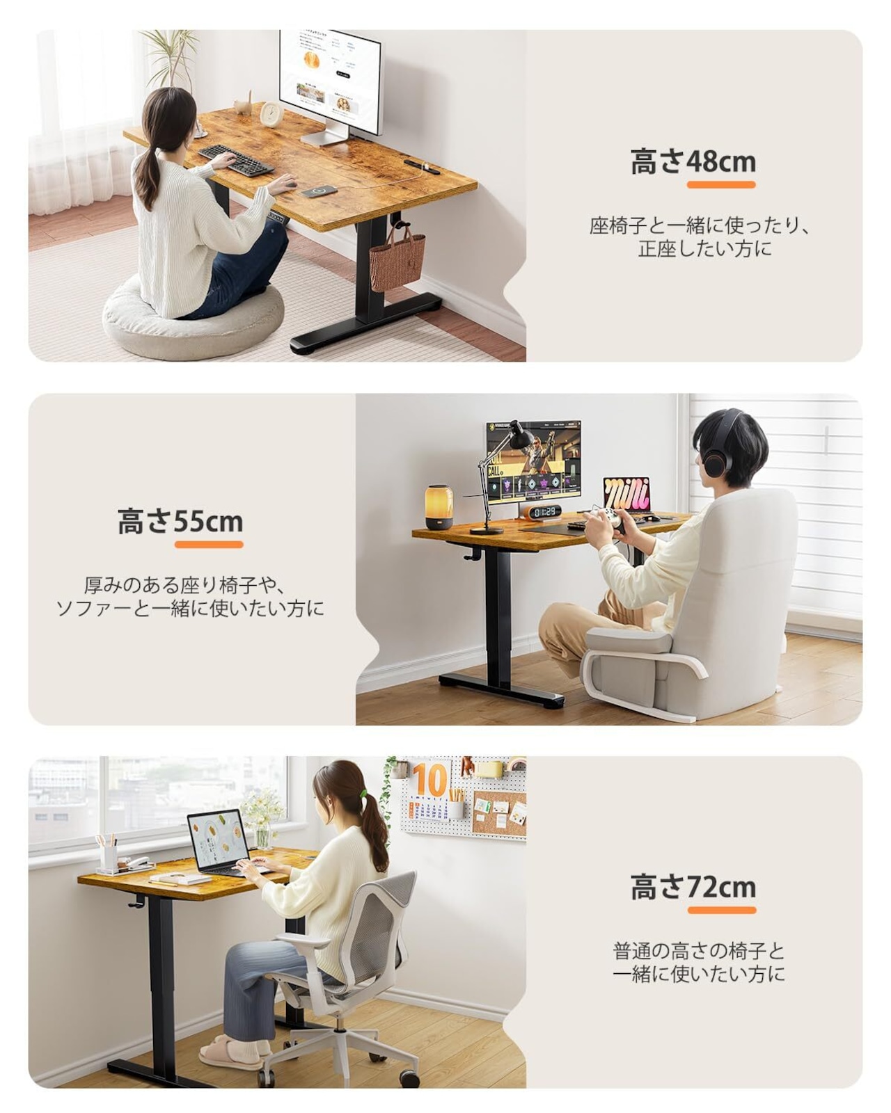 【ワンタッチで昇降可能なローデスク】簡単なボタン操作で天板を無段階に高さ48~72cm昇降でき、用途やお持ちの座椅子、体形などに合わせてちょうど良い高さを設定できます。普通の椅子から座椅子や座布団などまで、幅広く対応します。学習机として子供の成長とともに高さを自由に調節するのもおすすめです。また、高さを4ヶ所まで保存できるメモリー機能付きで、手軽いにお好みの高さまで調整できます。