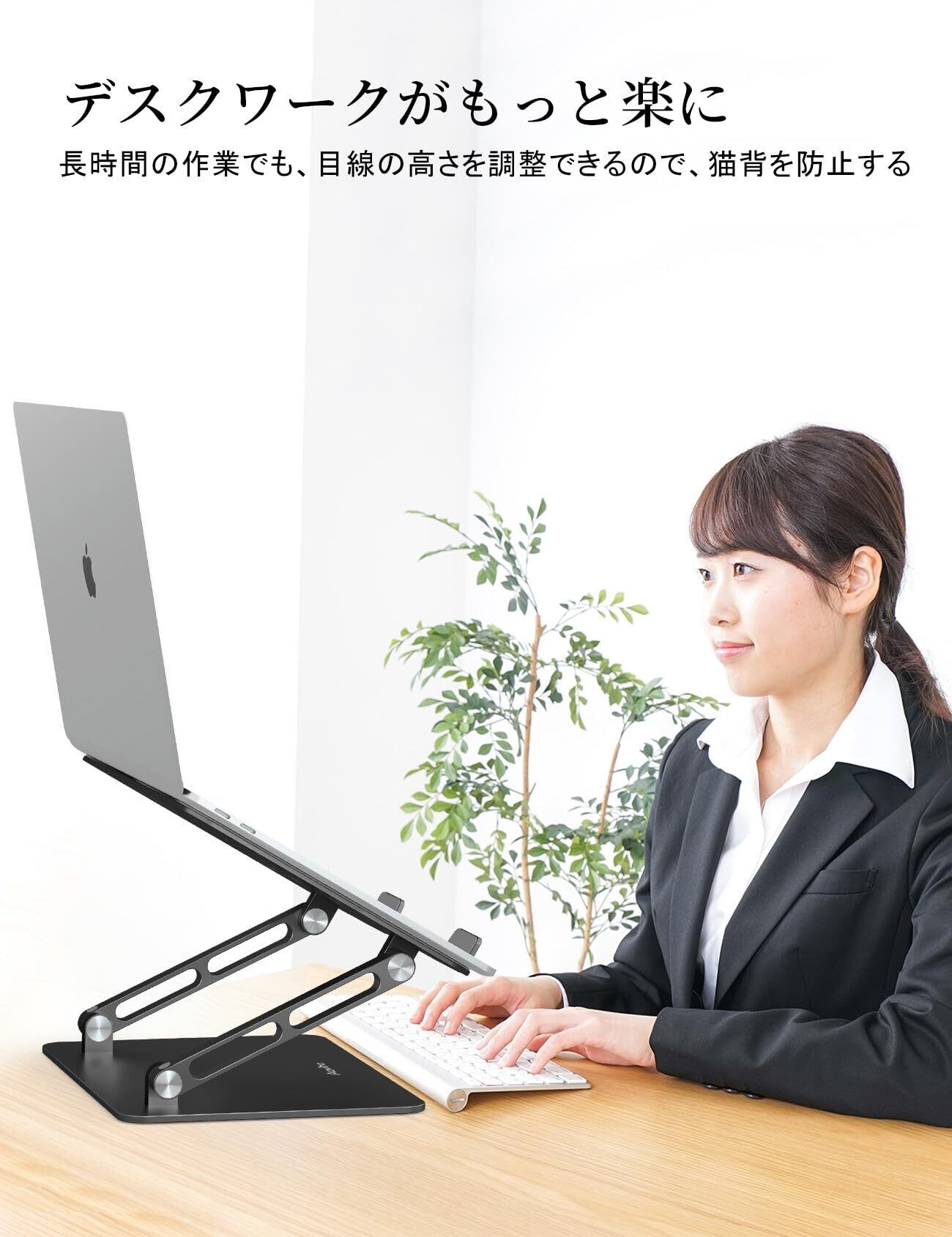 2、【角度自在&人間工学に基づく無段階調整】のノートパソコンスタンドは、人間工学に基づいたデザインにより、高度と角度を無段階に調整可能です。PC作業やタブレット使用時も、最適な高さや角度にカスタマイズでき、自宅でのワークスタイルを快適にサポートします。スタンドを使用すれば、パソコン画面と視線がぴったり合い、姿勢が自然と正され、背筋が伸びます。これにより、長時間の作業でも首や肩への負担を軽減し、猫背や腰痛を効果的に予防します。