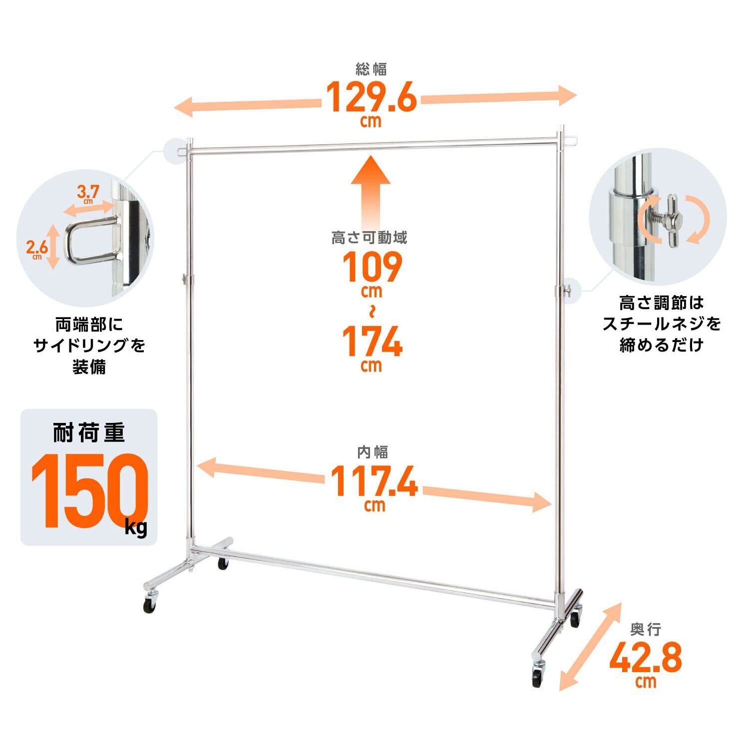 【商品詳細】[サイズ]幅:1296(柱芯々1200)mm×奥行:428mm×高さ:1090~1740mm 内パイプ:φ22.2mm 外パイプ:φ25.4mm [材質]スチール製 上段:クロームメッキ 下段:黒(粉体塗装) [耐荷重]約150kg [本体重量]約5.1kg [製造国]台湾 [付属品]六角レンチ アジャスター
